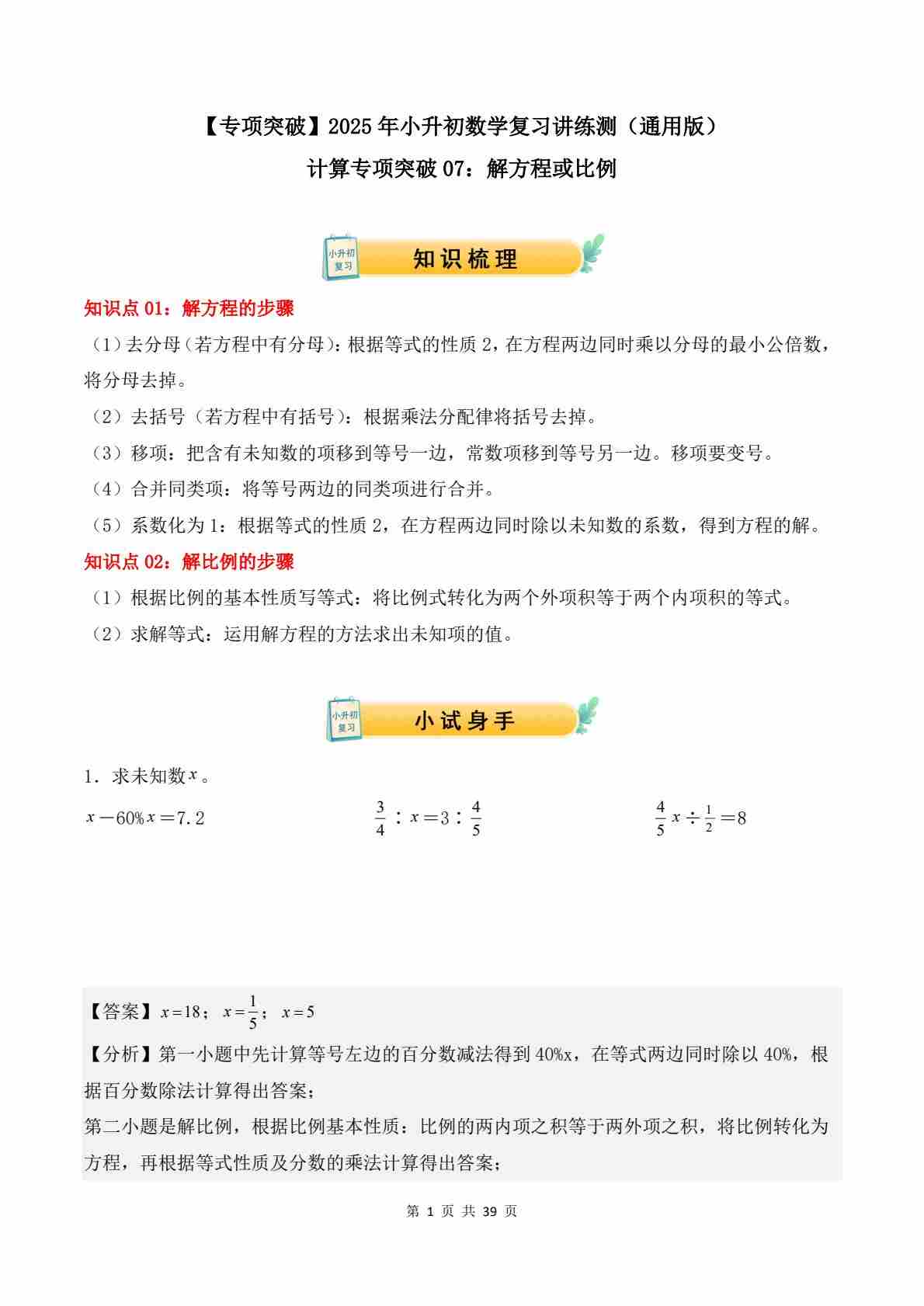 计算专项突破07:解方程或比例-2025年小升初数学复习讲练测(通用版)(教师版)