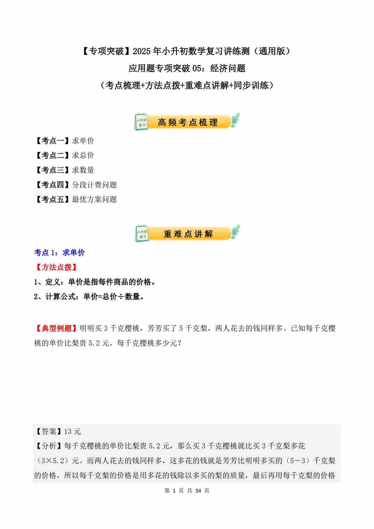 应用题专项突破01:归一问题(学生版)-2025年小升初数学应用题专项突破(通用版)