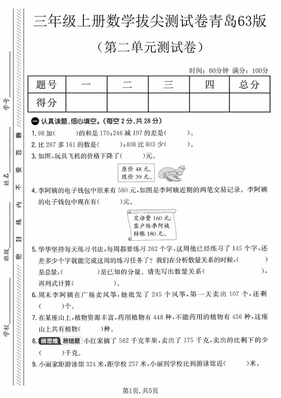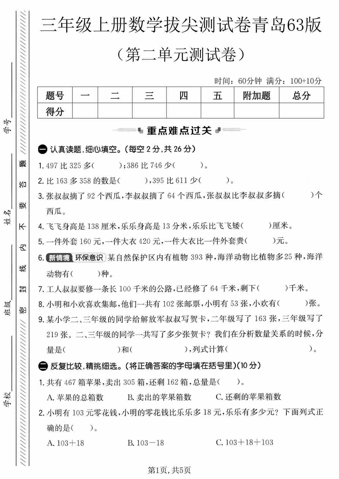 三年级(上)数学 第五单元拔尖测试卷《青岛63版》