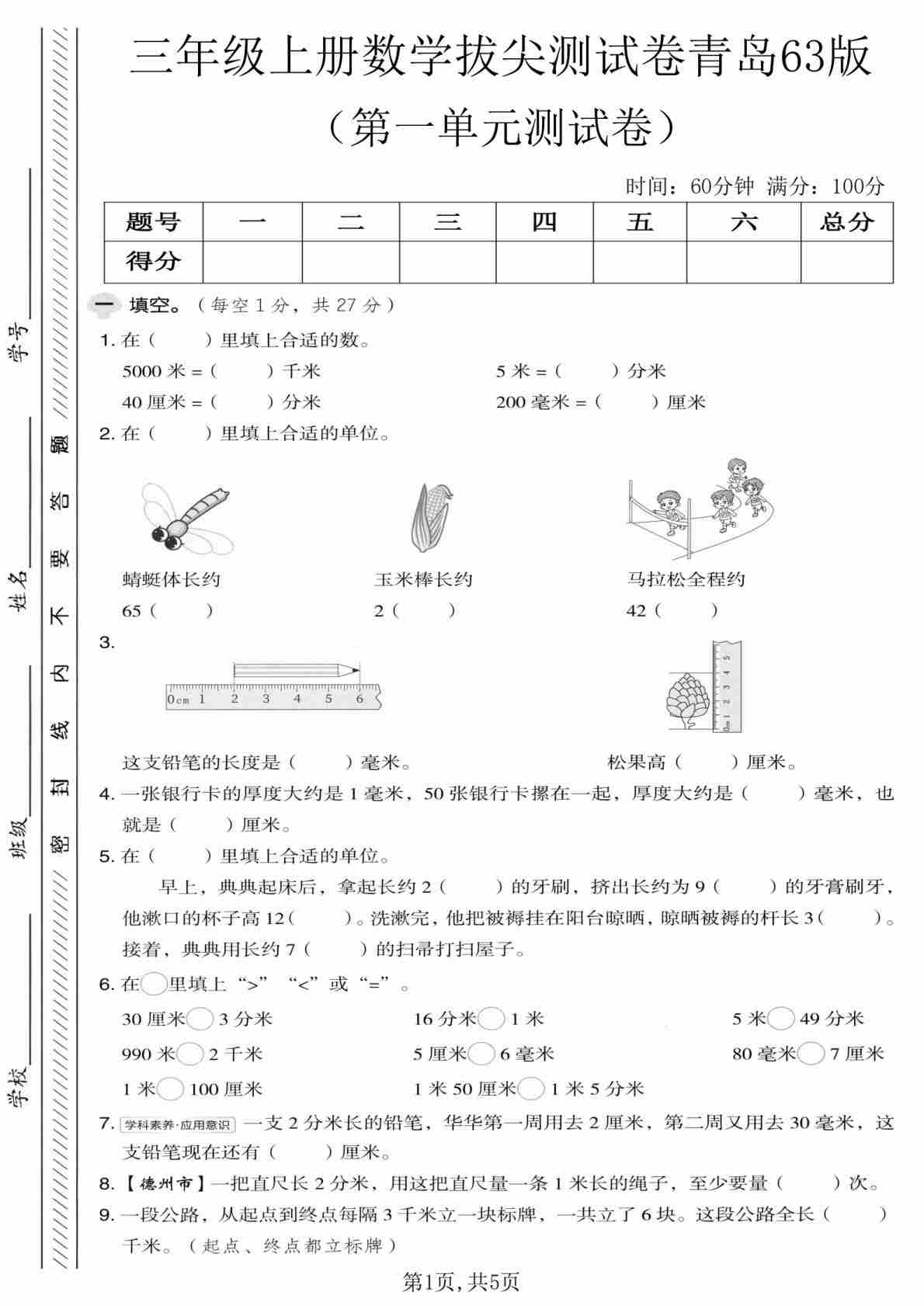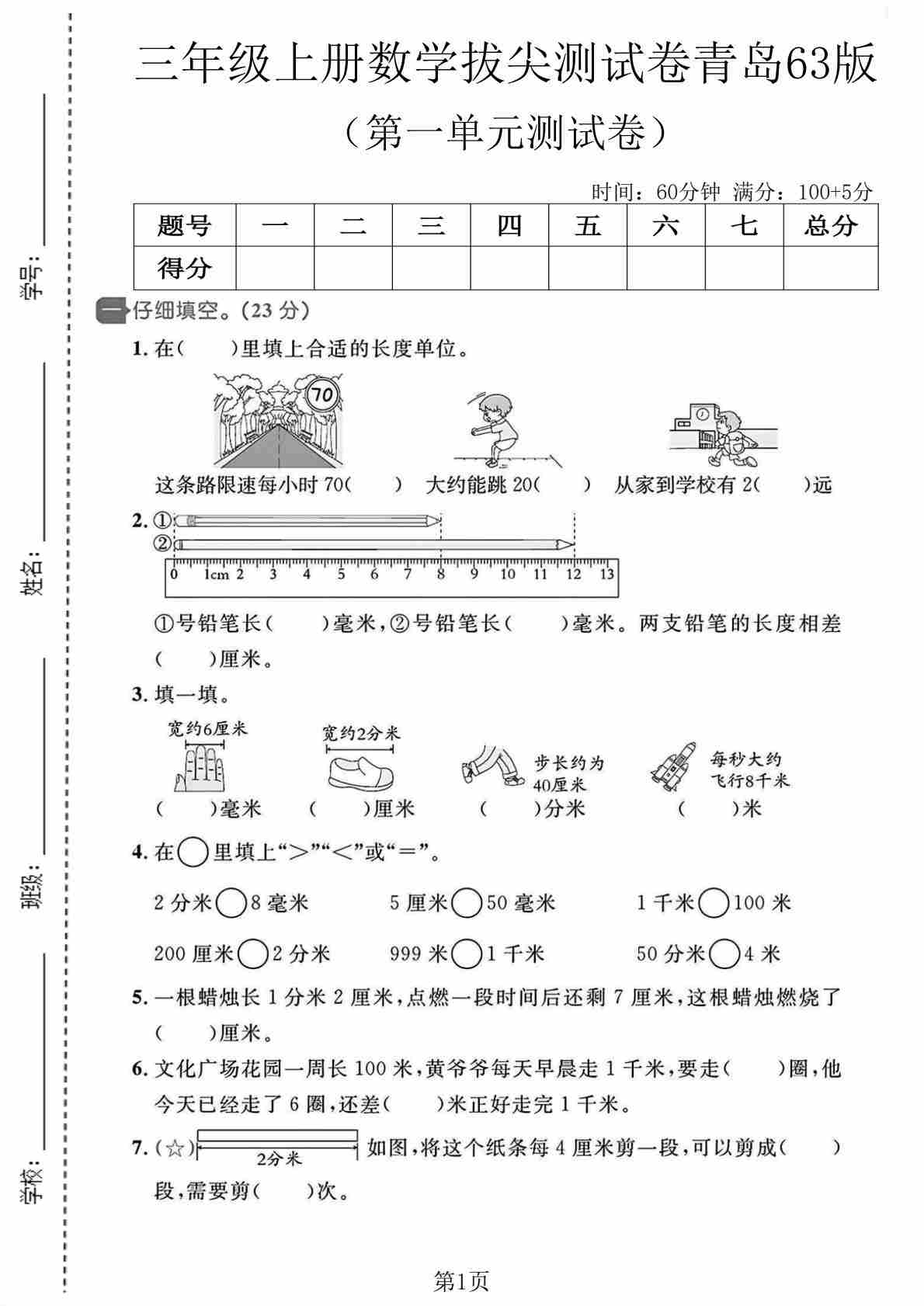 三(上)数学2025秋青岛六三制【第一单元拔尖测试卷3】