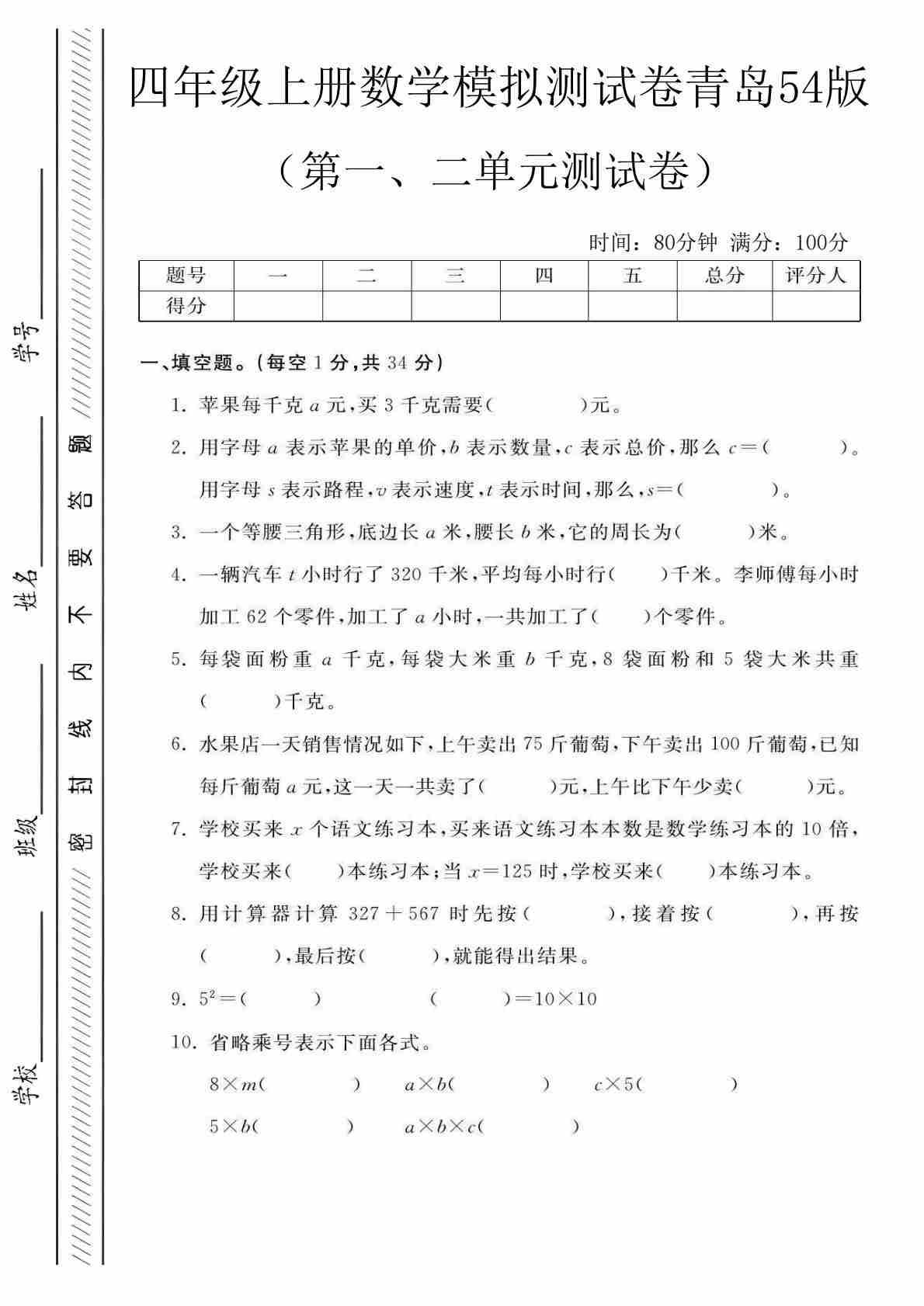 四上青岛五四制数学【第十单元测试卷1】