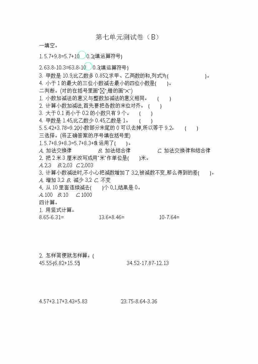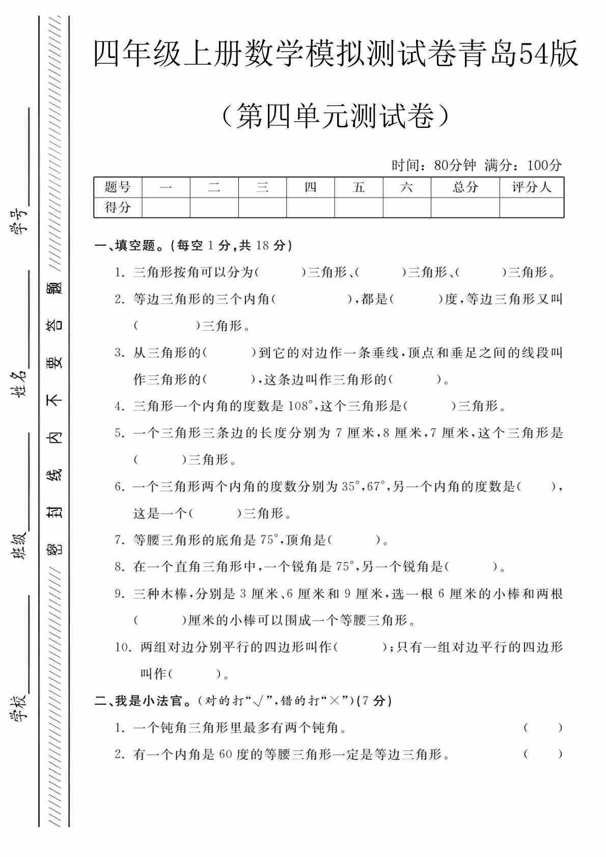 四上青岛五四制数学【第七单元测试卷】