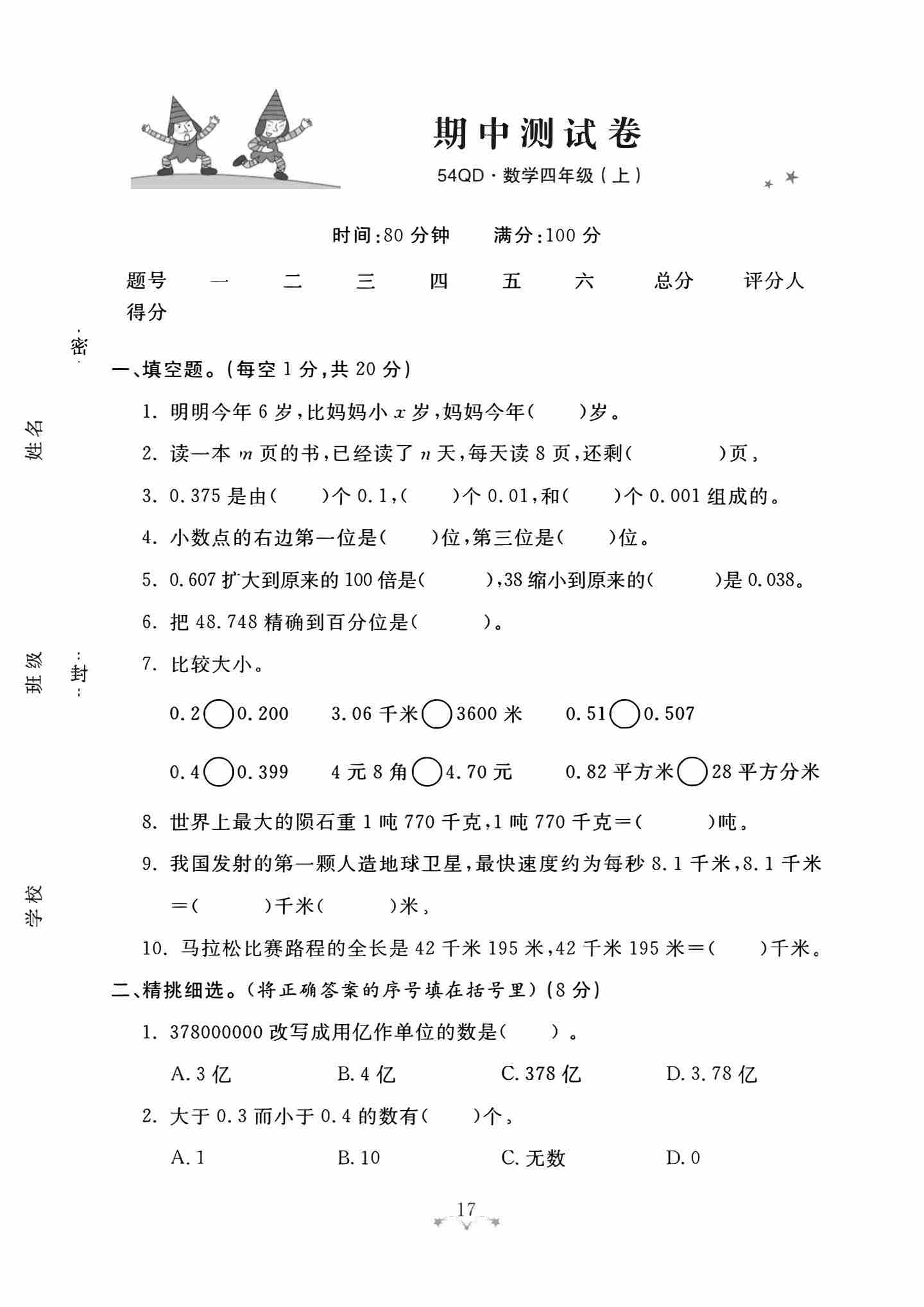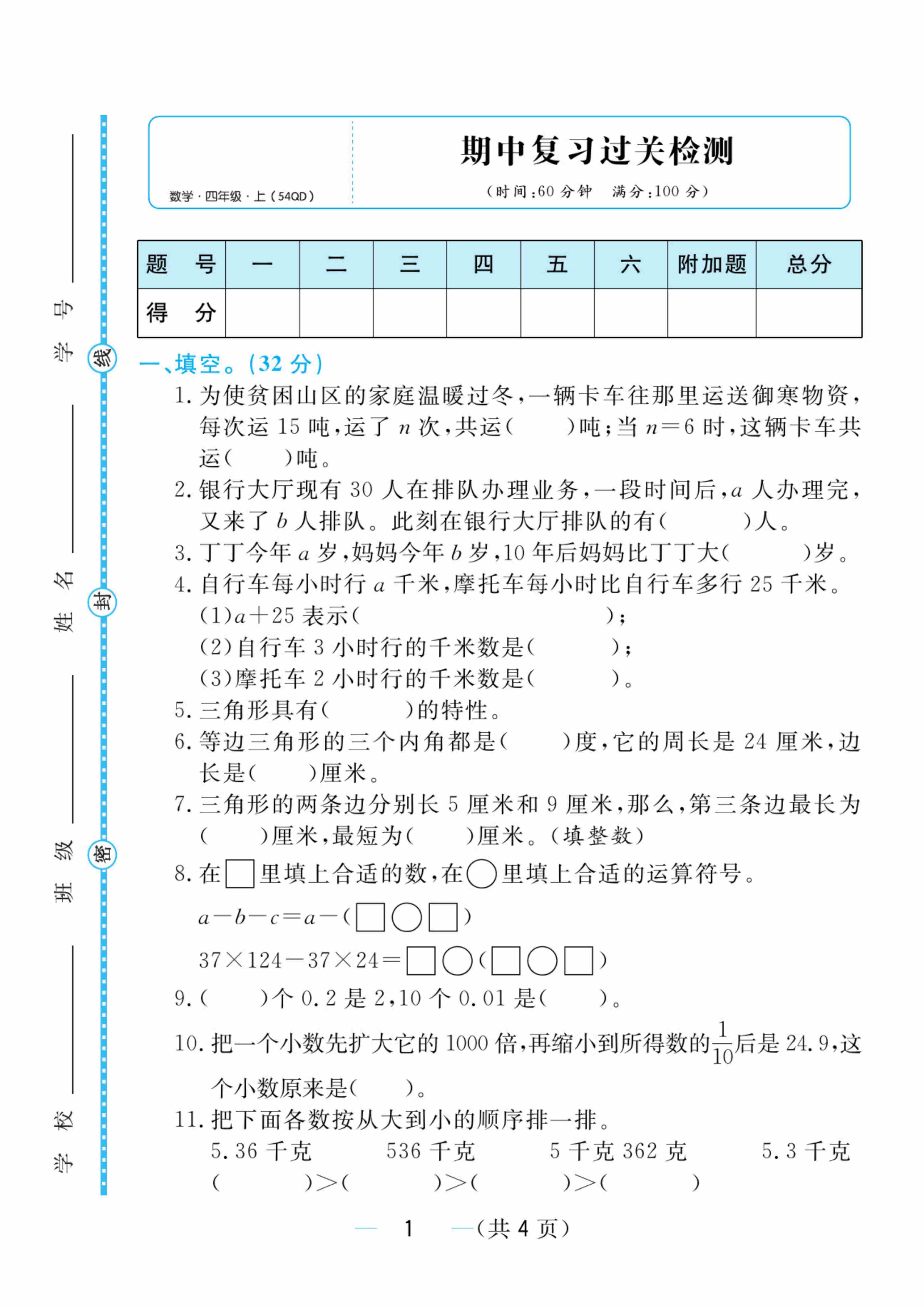 四年级(上)数学 期中测试卷《青岛54版》