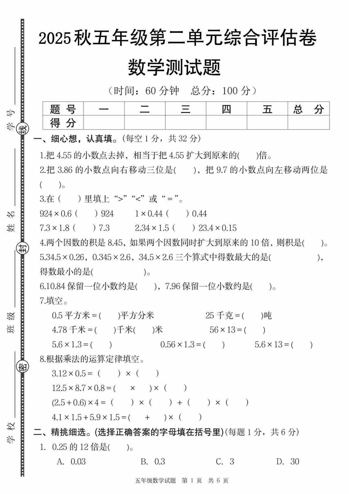 五上冀教版数学【2025秋-第二单元综合评估卷】