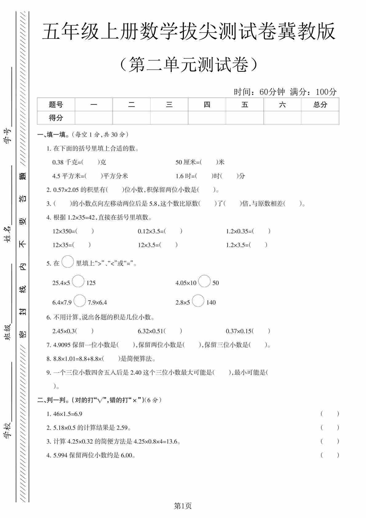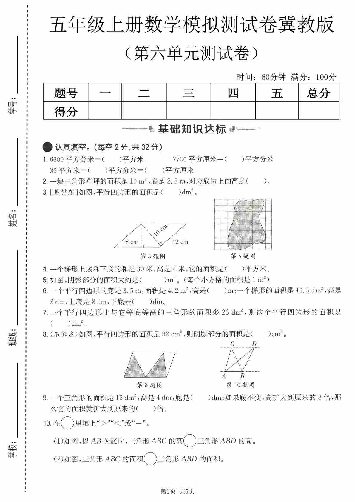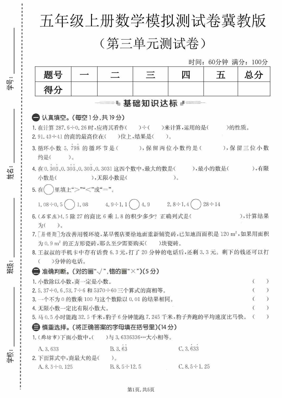 五年级(上)数学 第五单元模拟测试卷《冀教版》