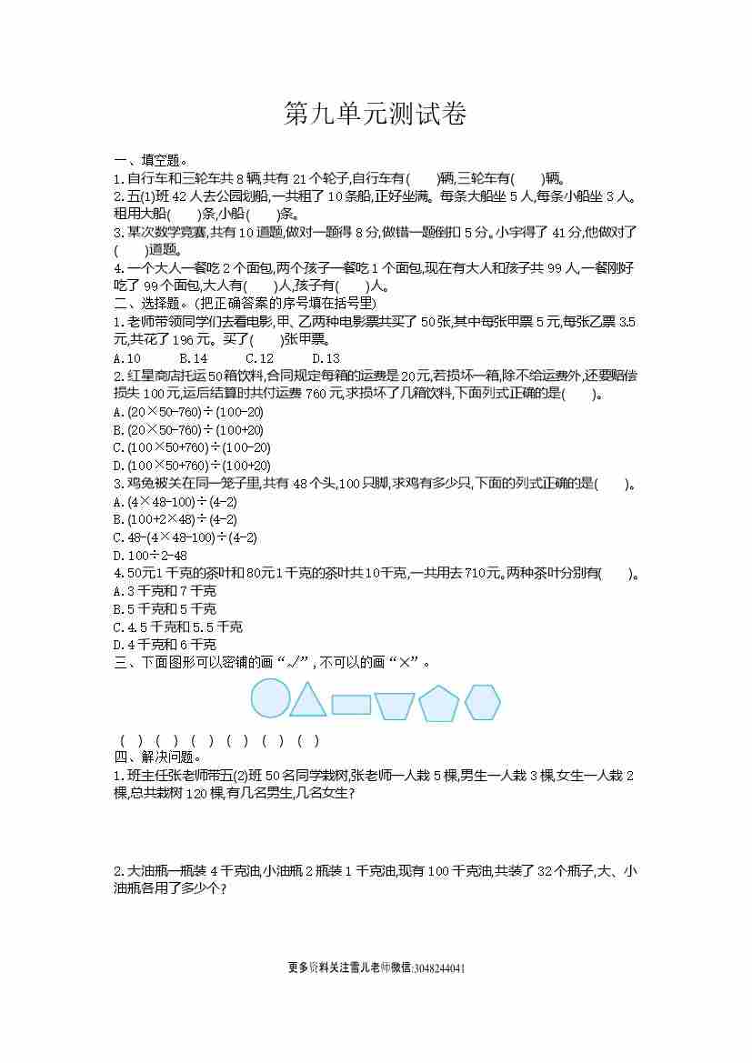 五年级(上)数学第八、九单元测试卷2《冀教版》