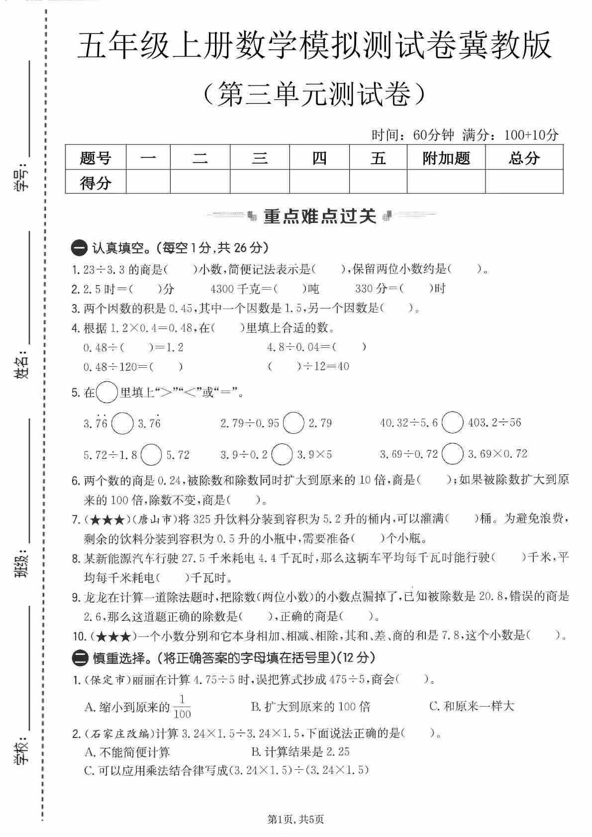 五年级(上)数学 第三单元模拟测试卷《冀教版》