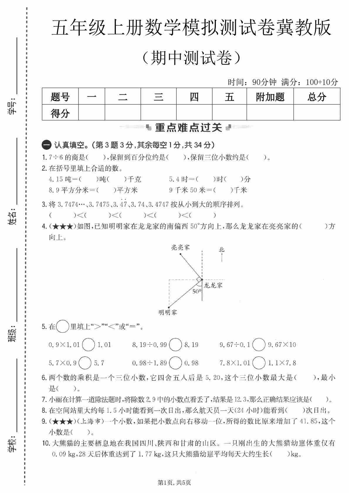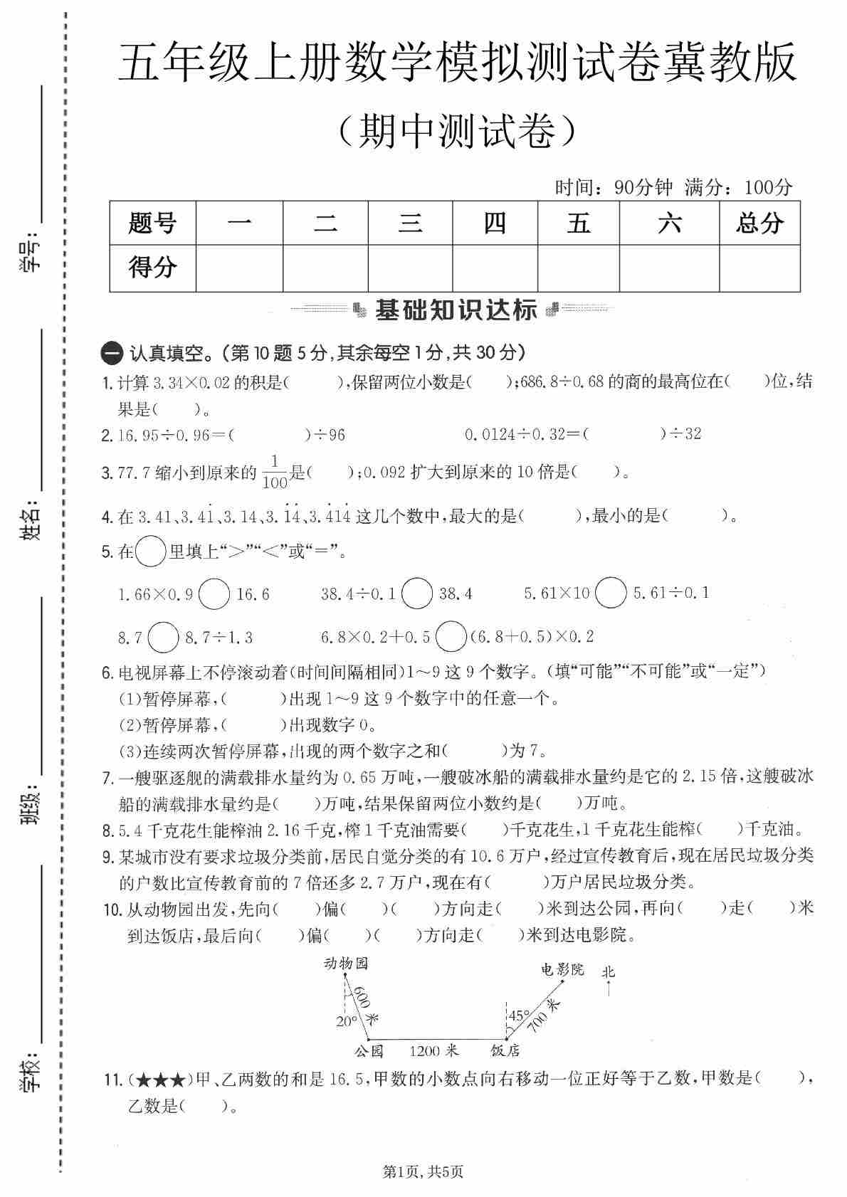 五年级(上)数学 期中模拟测试卷《冀教版》1