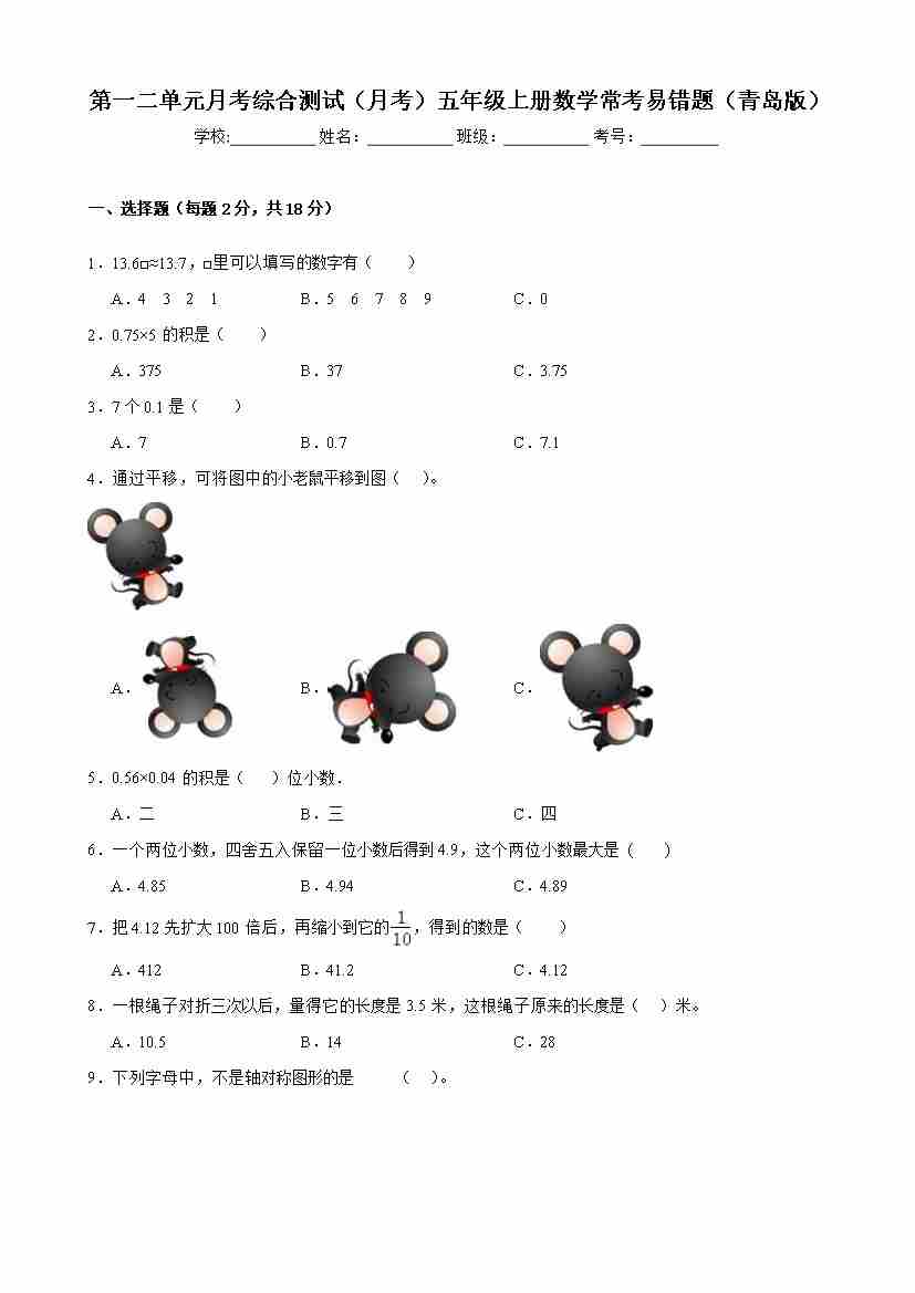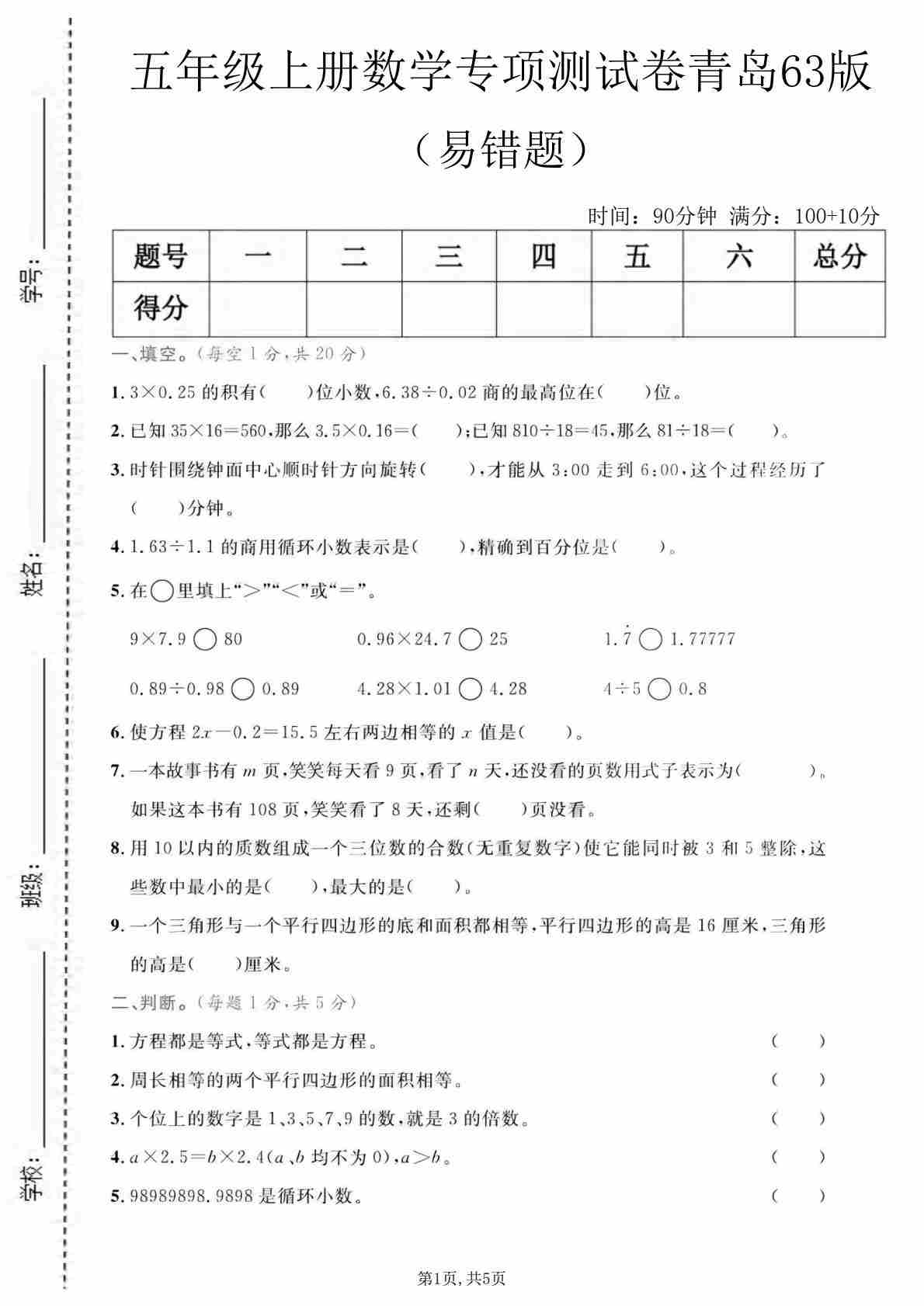 五年级(上)数学 《易错题》专项测试卷《青岛63版》