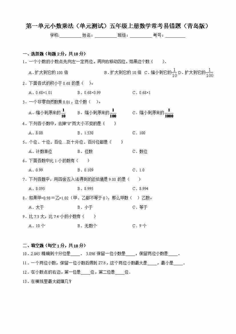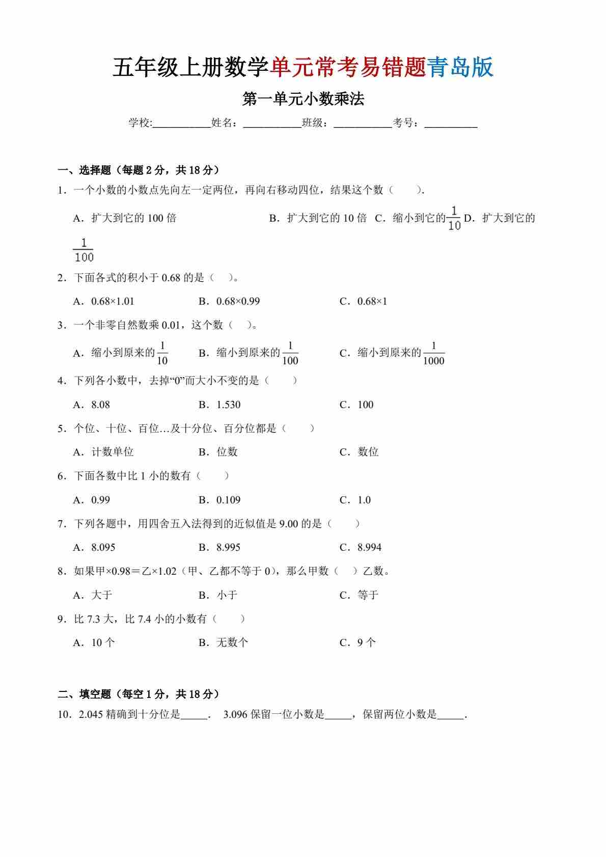 【青岛数学】第一单元小数乘法(单元测试)五年级上册数学常考易错题(青岛版)