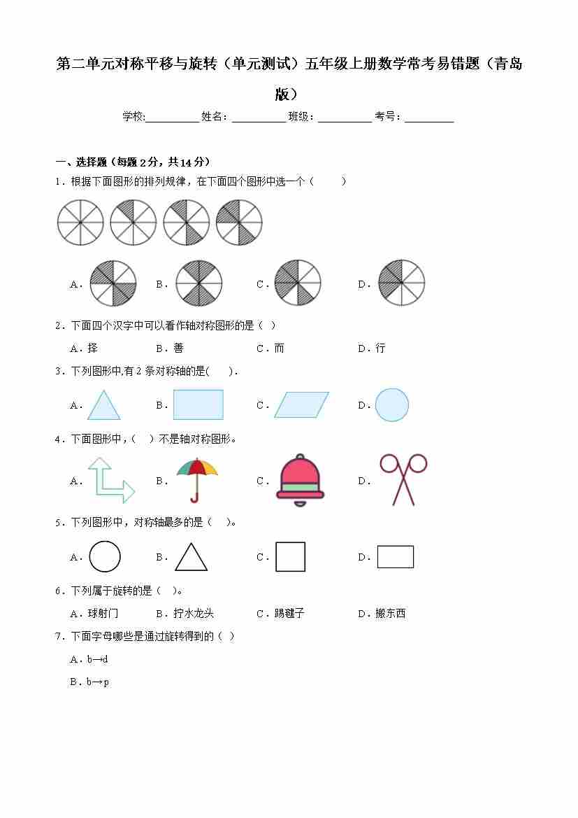 【青岛数学】第二单元对称平移与旋转(单元测试)五年级上册数学常考易错题(青岛版)