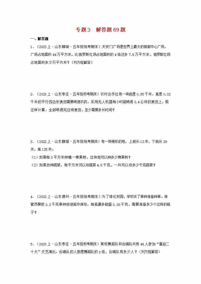 【青岛版数学期末】专题3 解答题69题五年级数学上册期末备考真题分类汇编(青岛版
