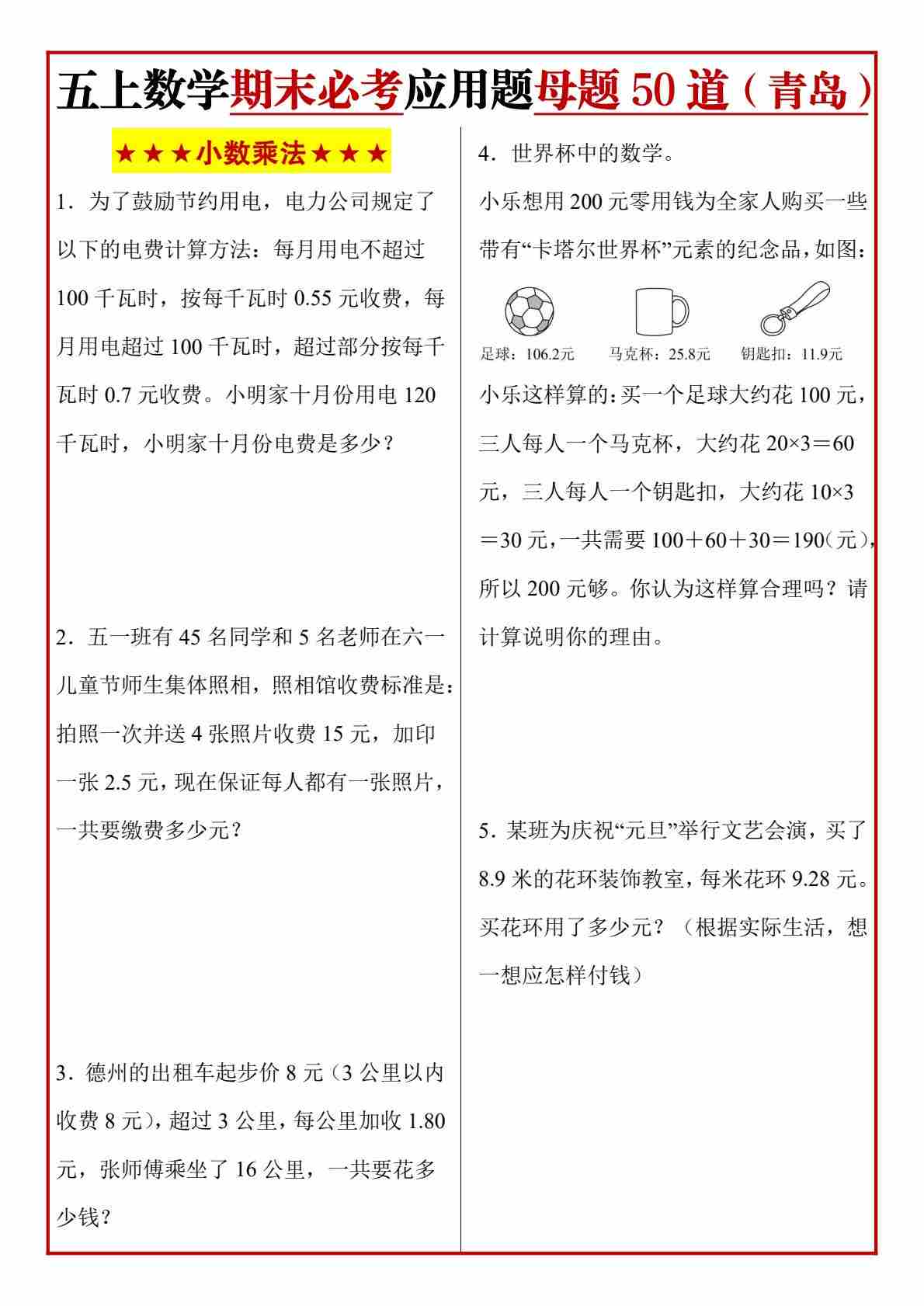 五年级(上)数学 小数乘法与除法专项检测卷《青岛63版》