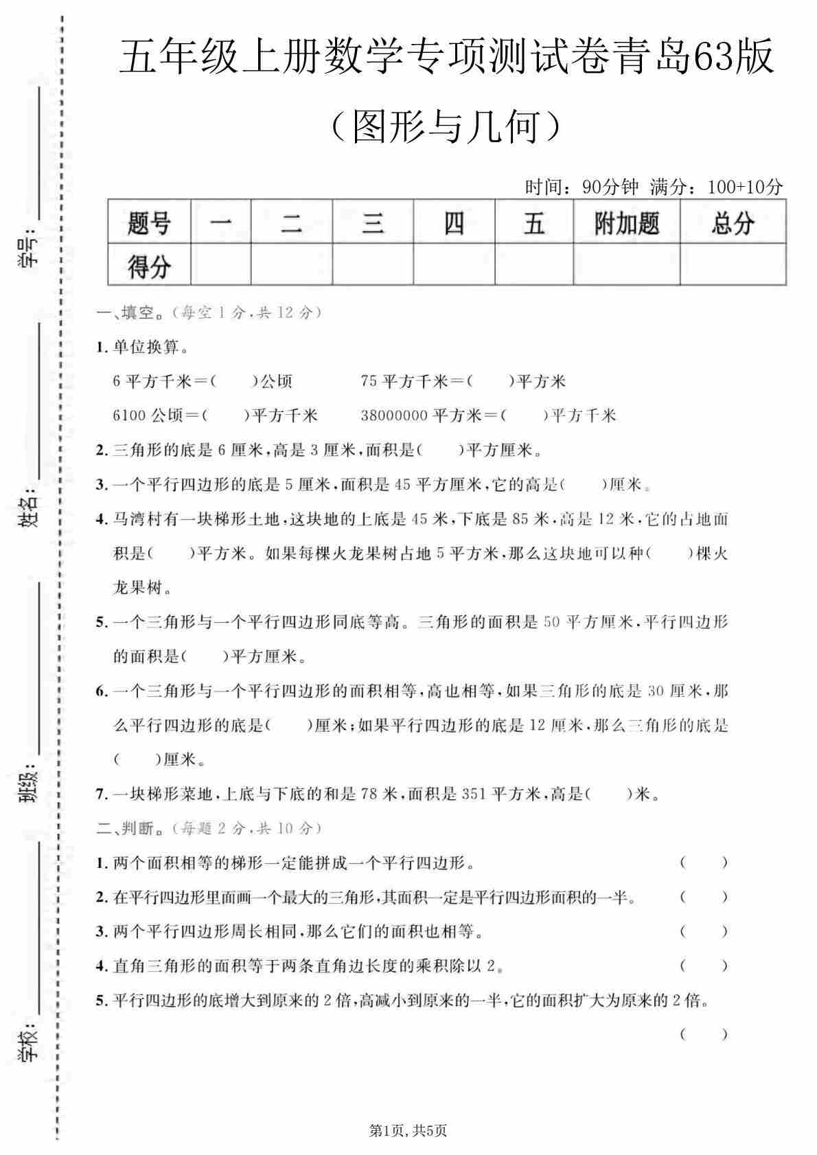 五年级(上)数学 《图形与几何》专项测试卷《青岛63版》