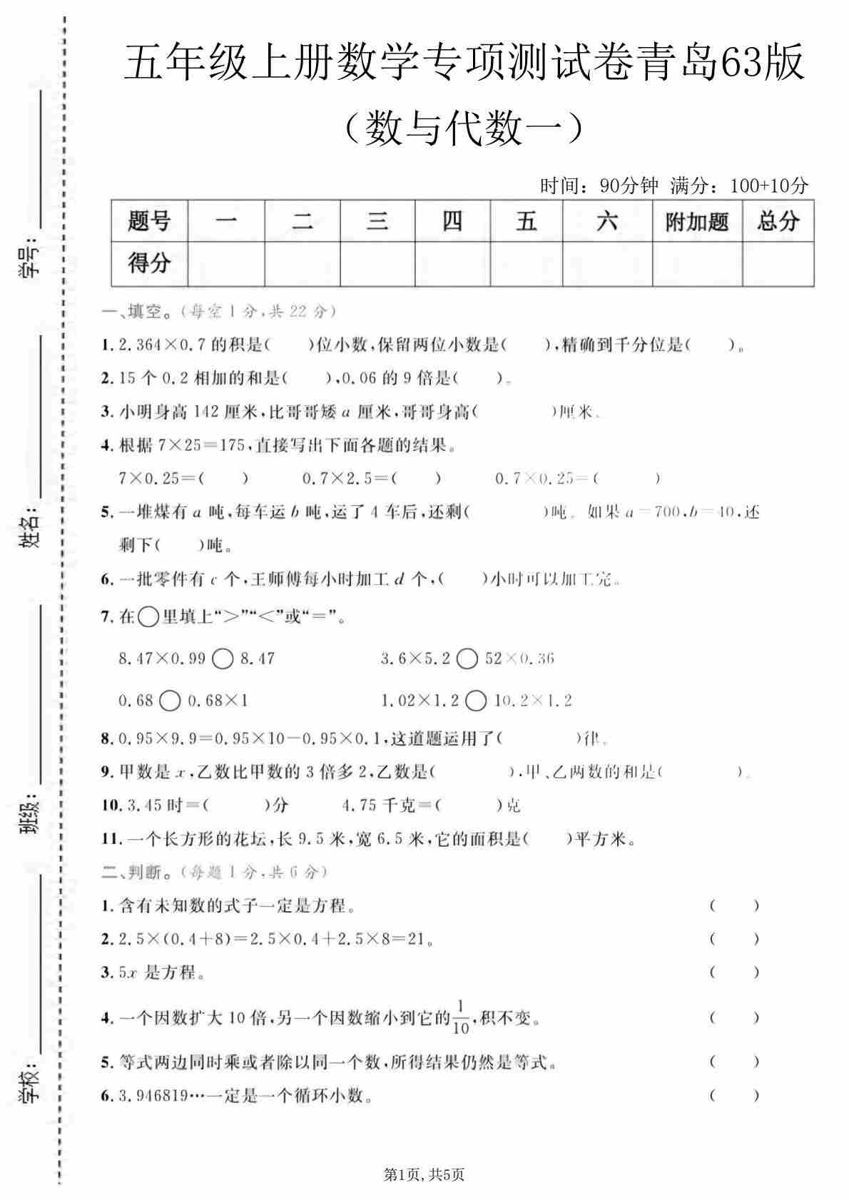 五年级(上)数学 《数与代数一》专项测试卷《青岛63版》