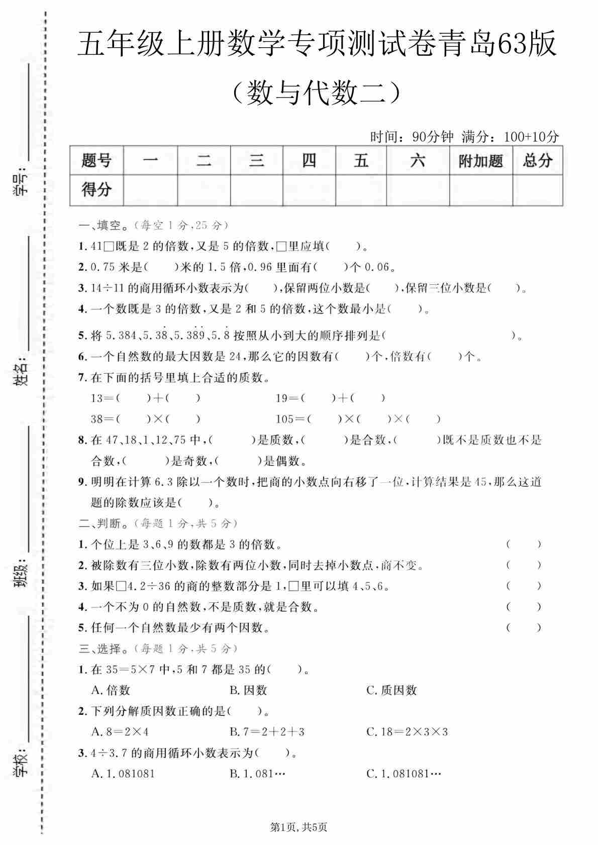 五年级(上)数学 《数与代数二》专项测试卷《青岛63版》