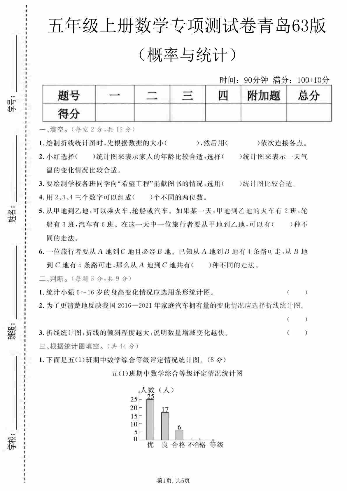 五年级(上)数学 统计与解决问题专项检测卷《青岛63版》