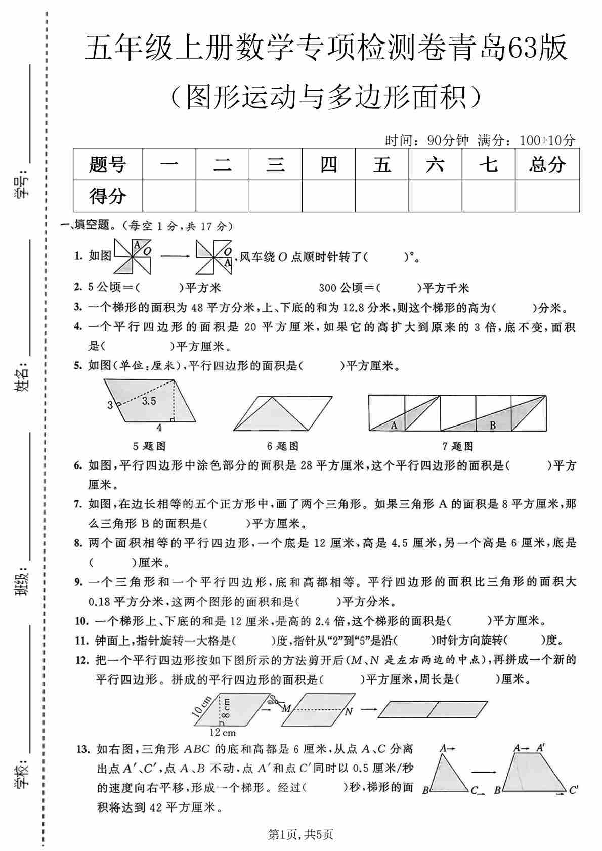 五年级(上)数学 图形运动与多边形面积专项检测卷《青岛63版》