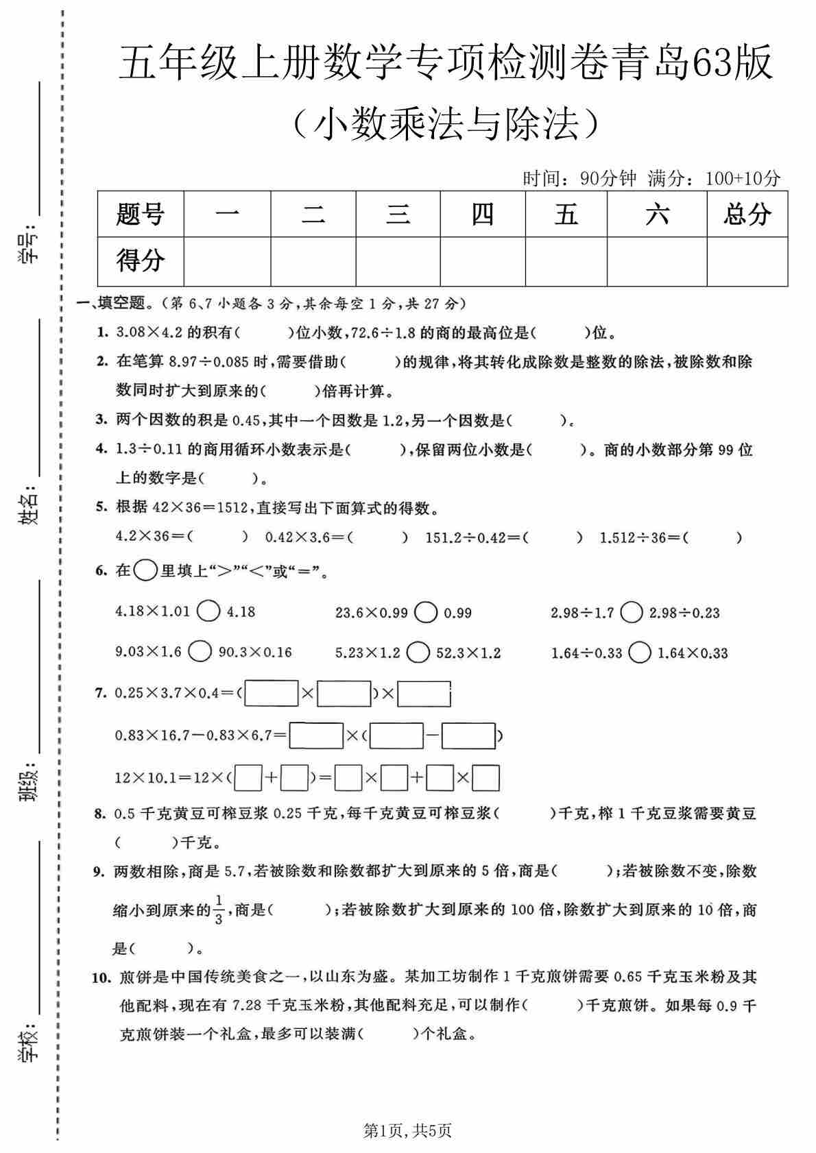 五年级(上)数学小数乘法与除法专项检测卷《青岛63版》
