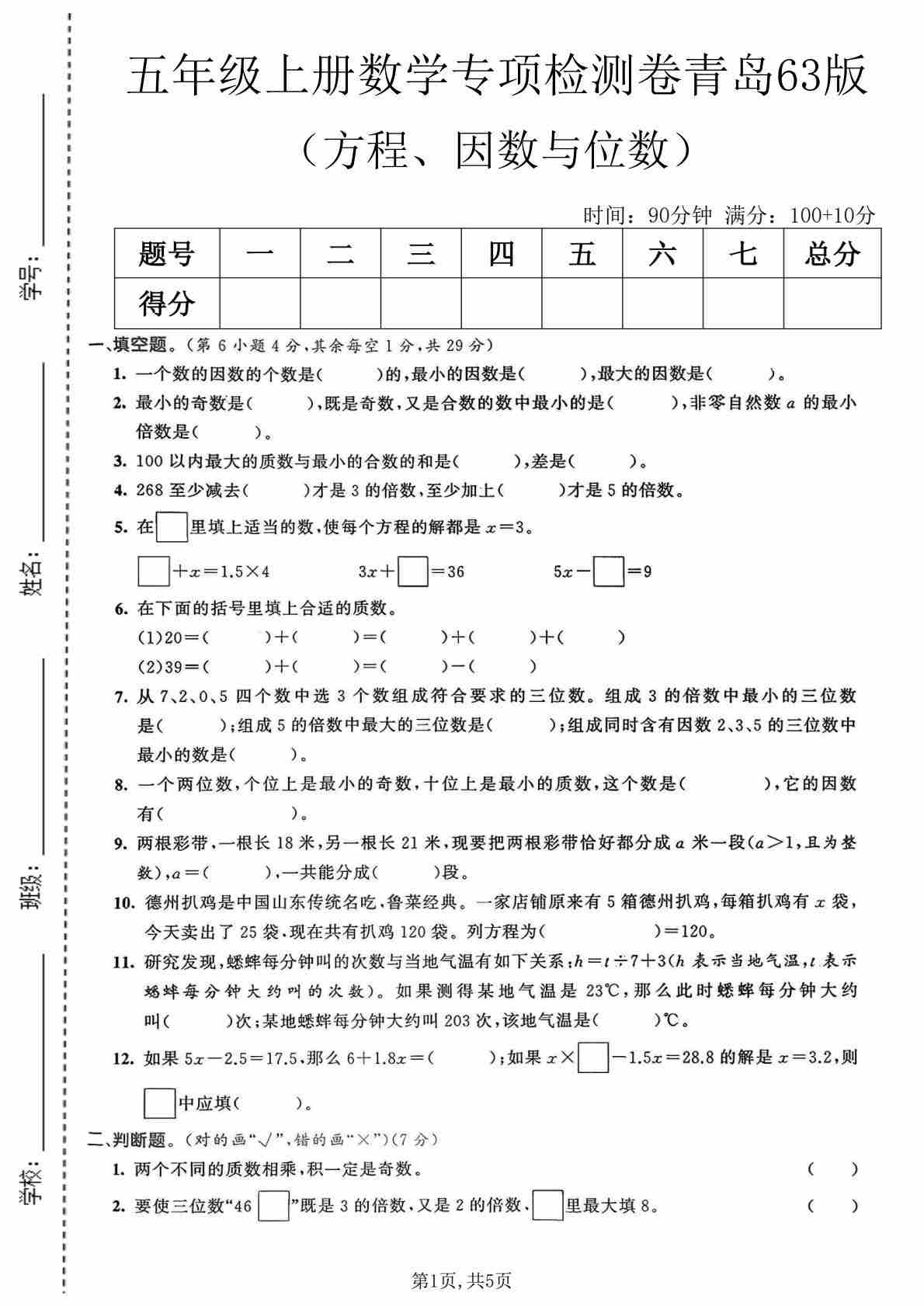 五年级(上)数学 方程、因数与位数专项检测卷《青岛63版》