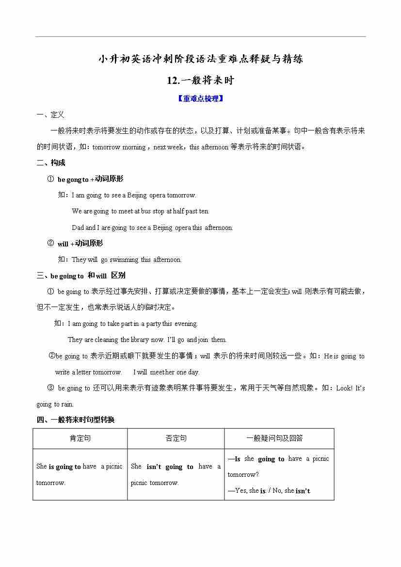 释疑与精练12 一般将来时(原卷版)-小升初英语冲刺阶段语法重难点释疑与精练(全国通用)