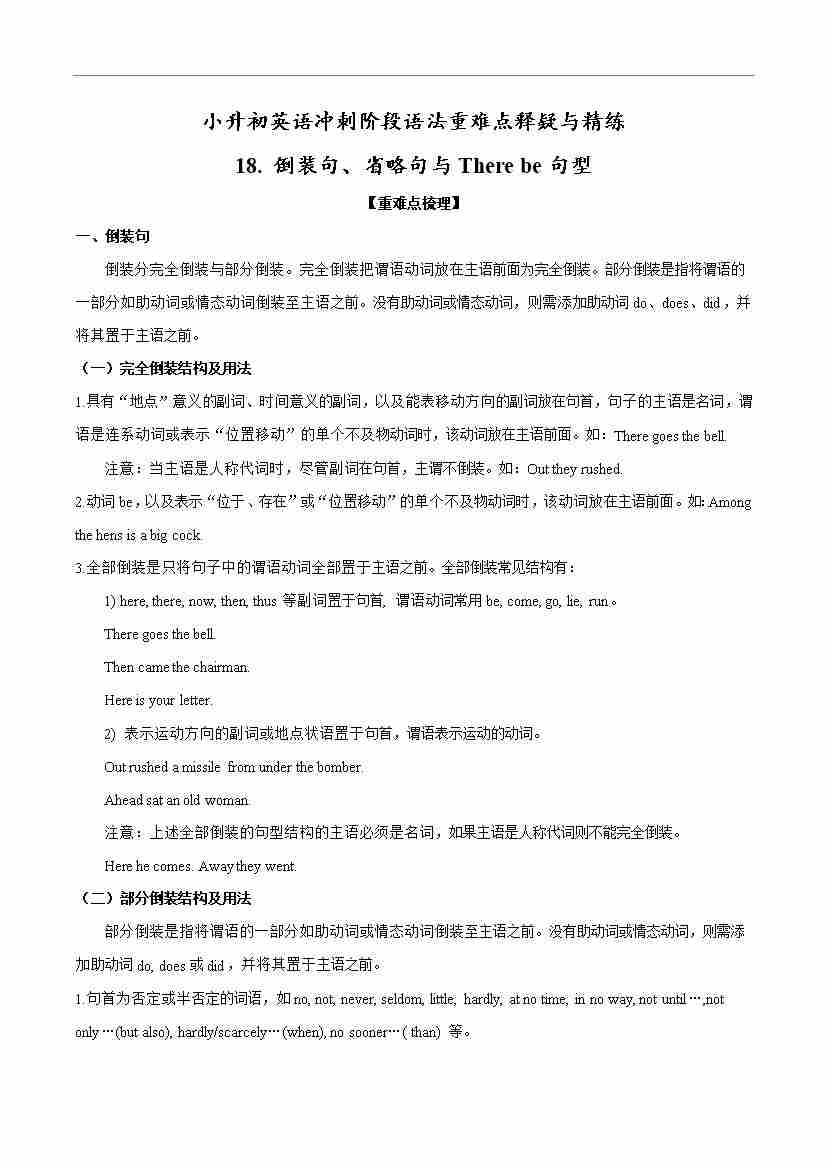 释疑与精练18 倒装句、省略句与There be句型(原卷版)-小升初英语冲刺阶段语法重难点释疑与精练(全国通用)