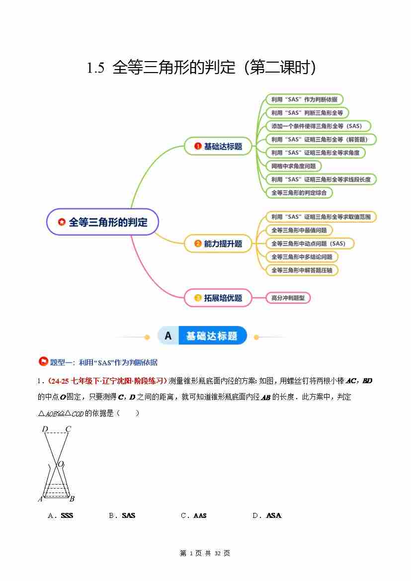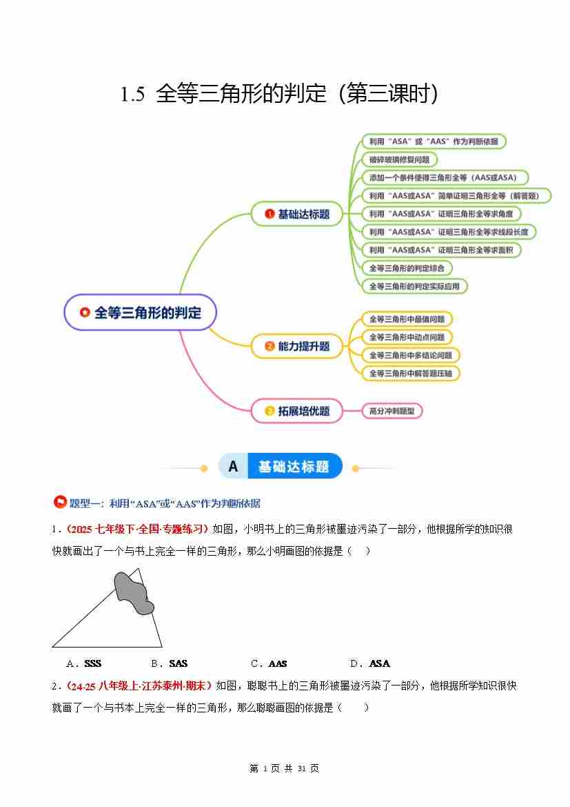 1.5 全等三角形的判定(第二课时)(题型专练)(原卷版)
