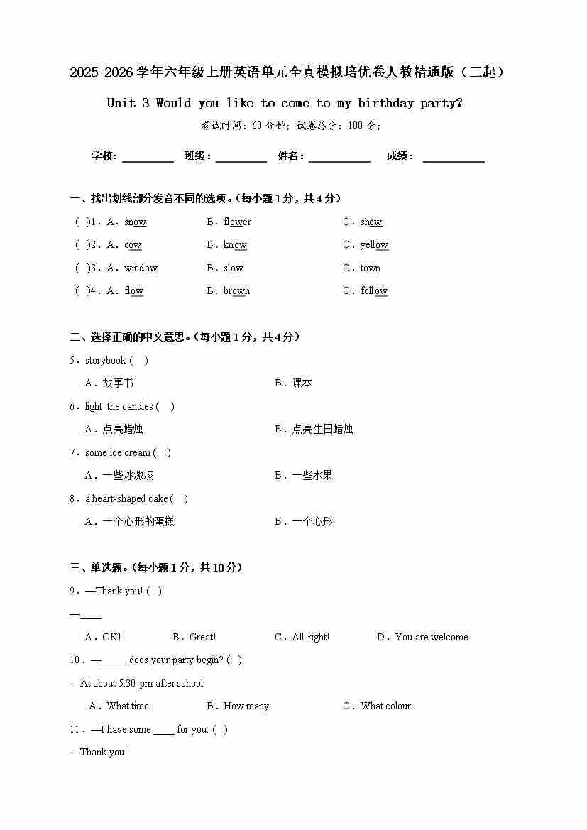 【单元测】英语六年级上册-Unit 3 Would you like to come to my birthday party 人教精通版(含答案)