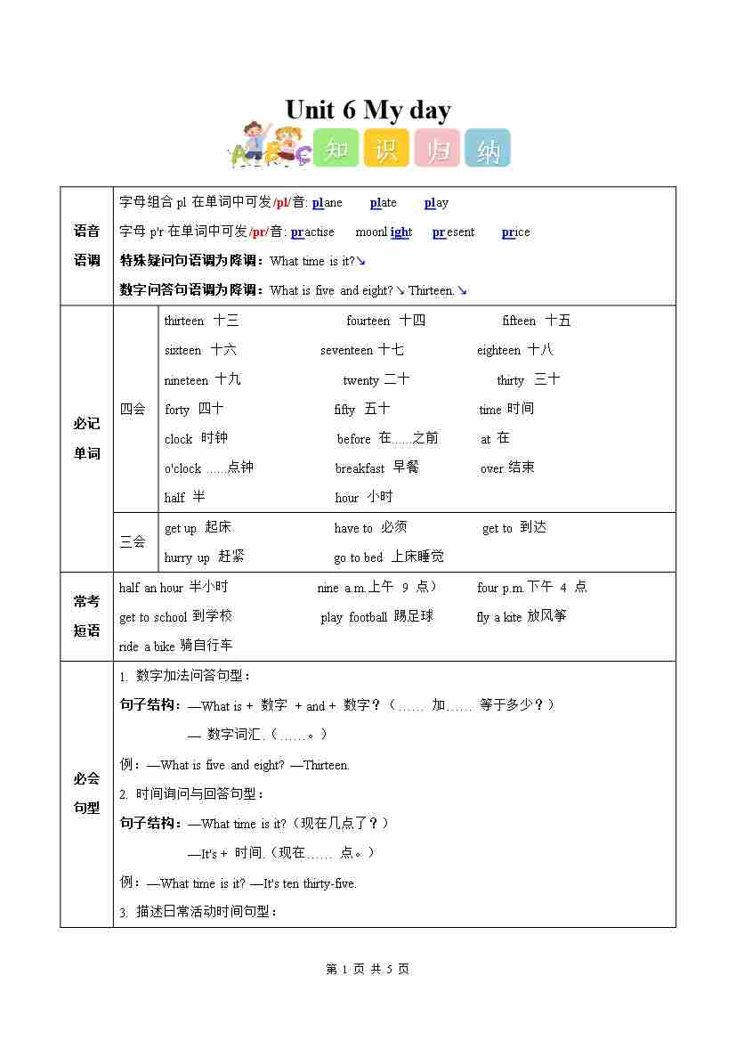 Unit 6 My day(知识清单)英语人教精通版四年级上册(新教材)