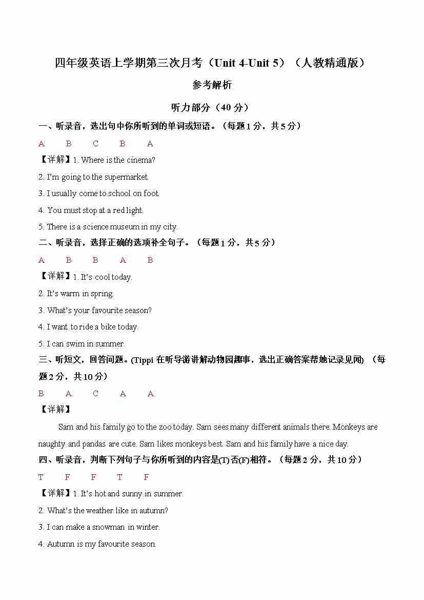 四上英语人教精通版第一次月考(Unit1-Unit2)(参考解析)