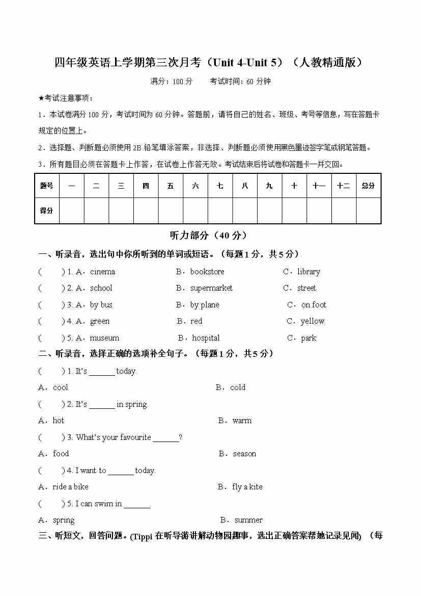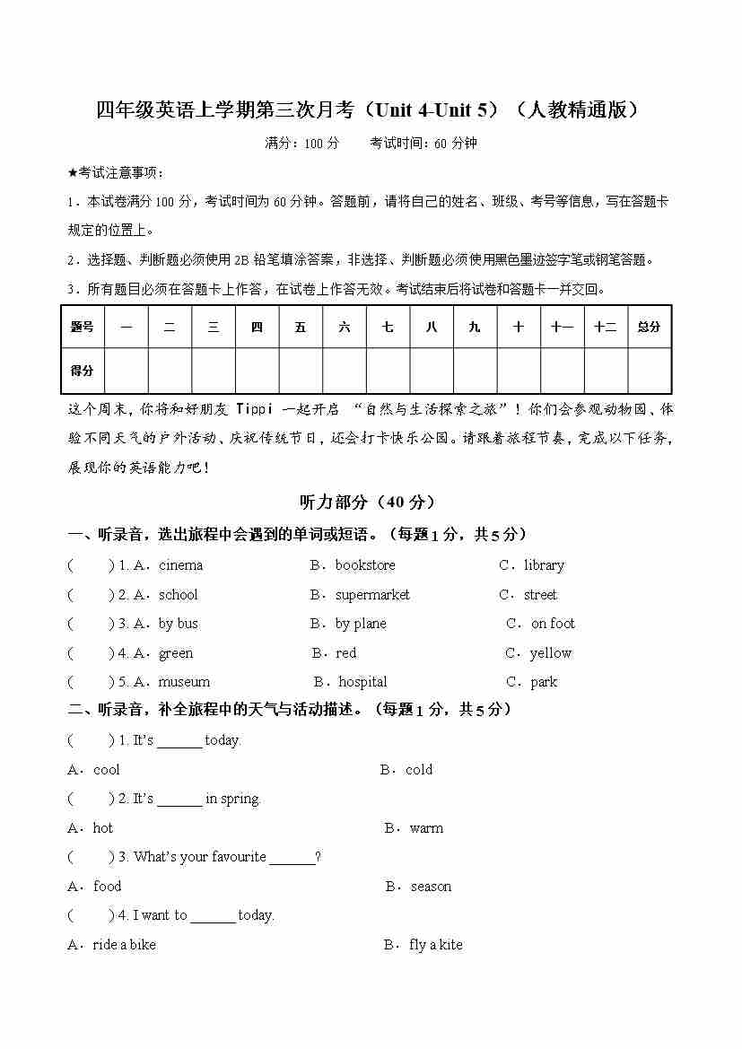 四上英语人教精通版第一次月考(Unit1-Unit2)(考试版A4)