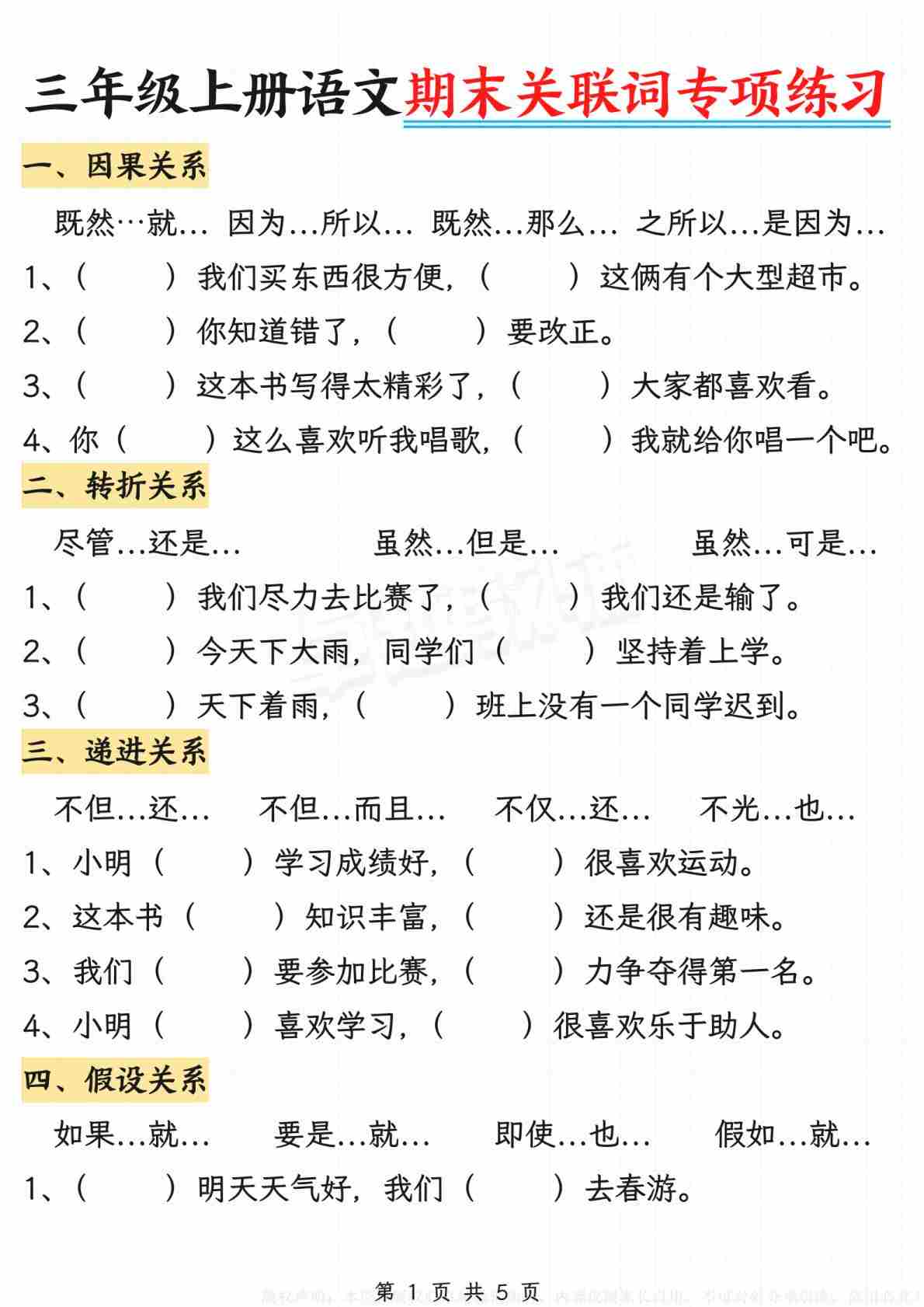 三上语文关联词语的运用期末专项练习(练习+答案)18页