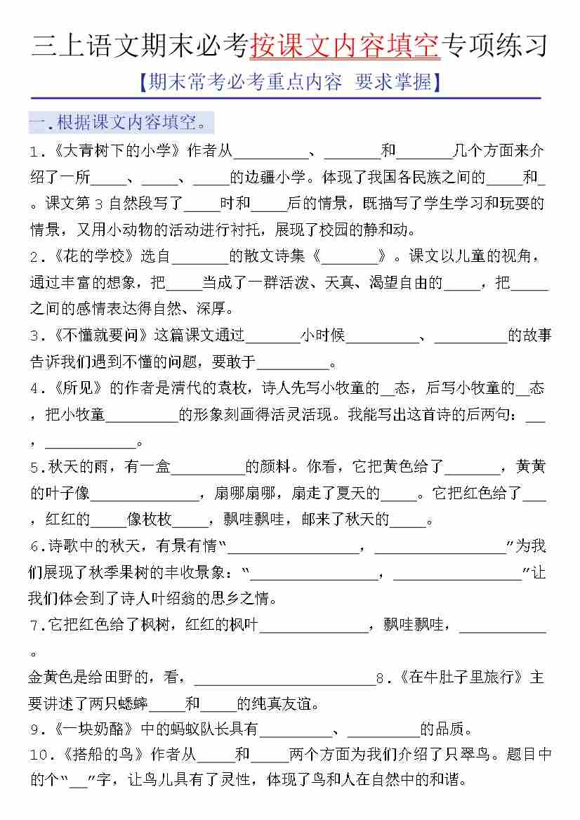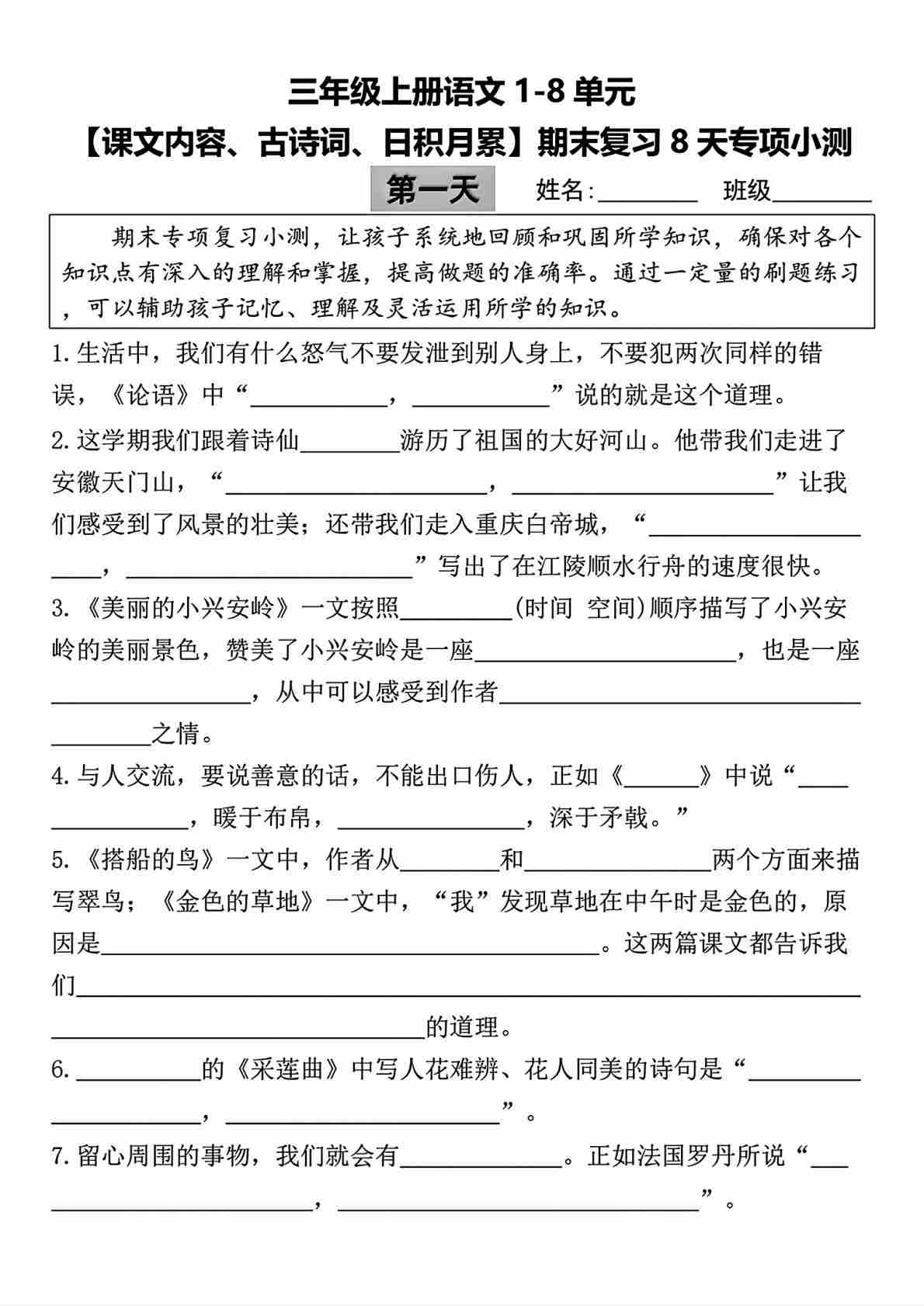 三上语文【期末总复习重点1-8单元古诗名言课文重点专项(练习+答案)】