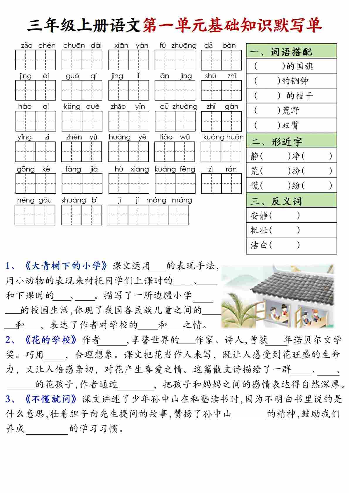 三上语文【1-8单元基础知识默写单-16页含答案】