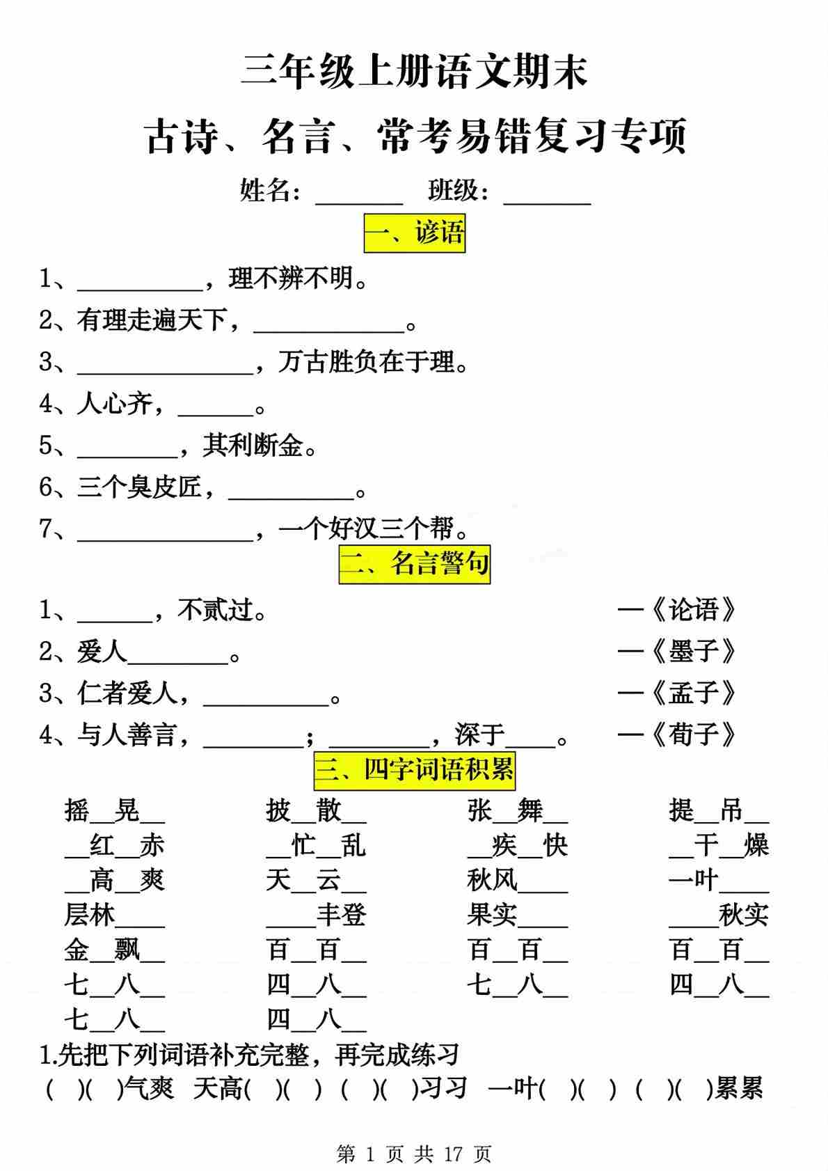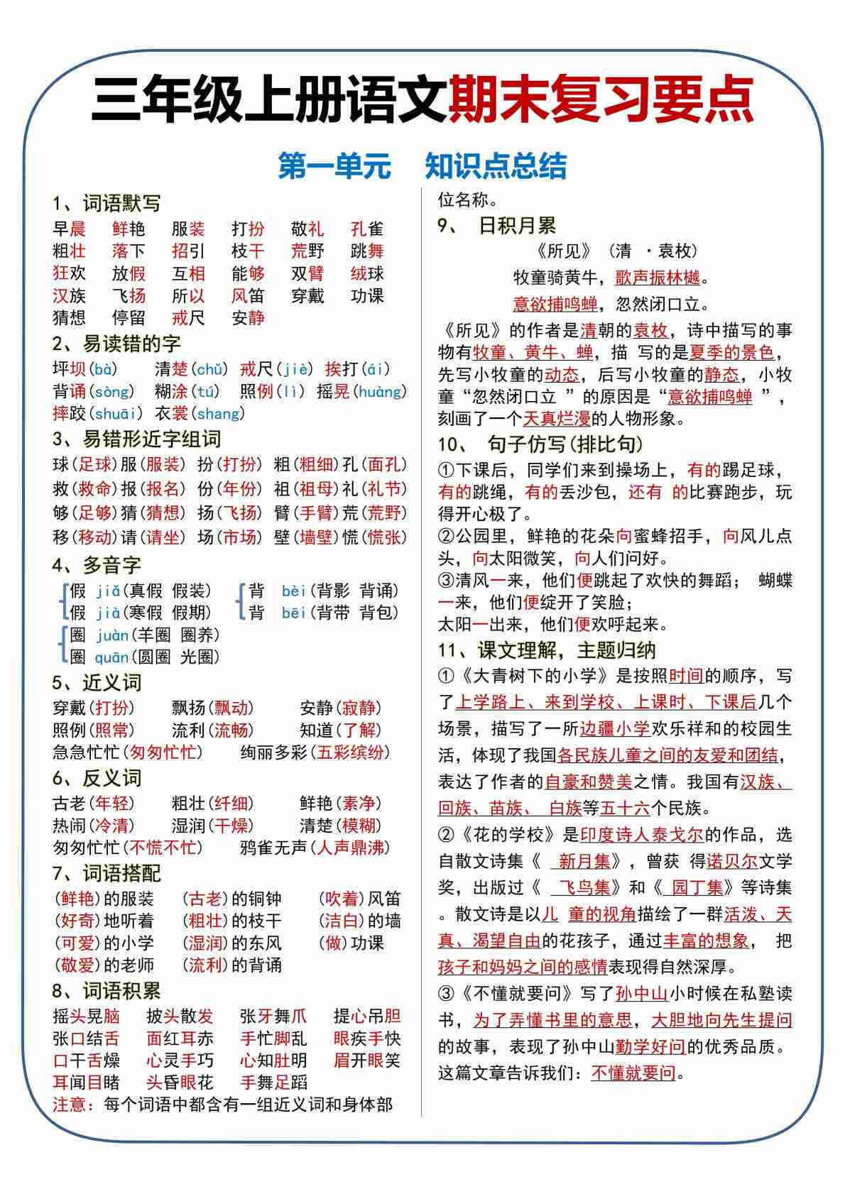 三上语文【期末复习重要高频知识汇总(15页)】