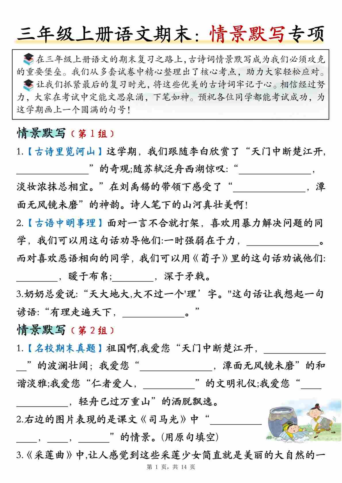三上语文【期末古诗词情景默写专项(含答案14页)】