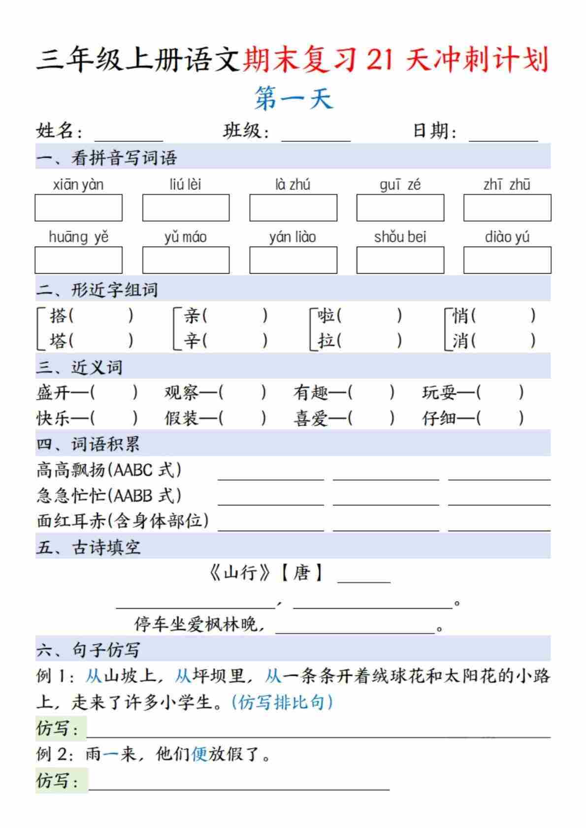 三上语文【期末复习21天冲刺计划每日一练】