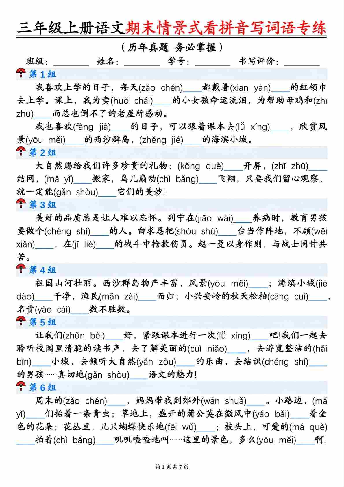 三上语文【期末复习看拼音写词语(情景题)】