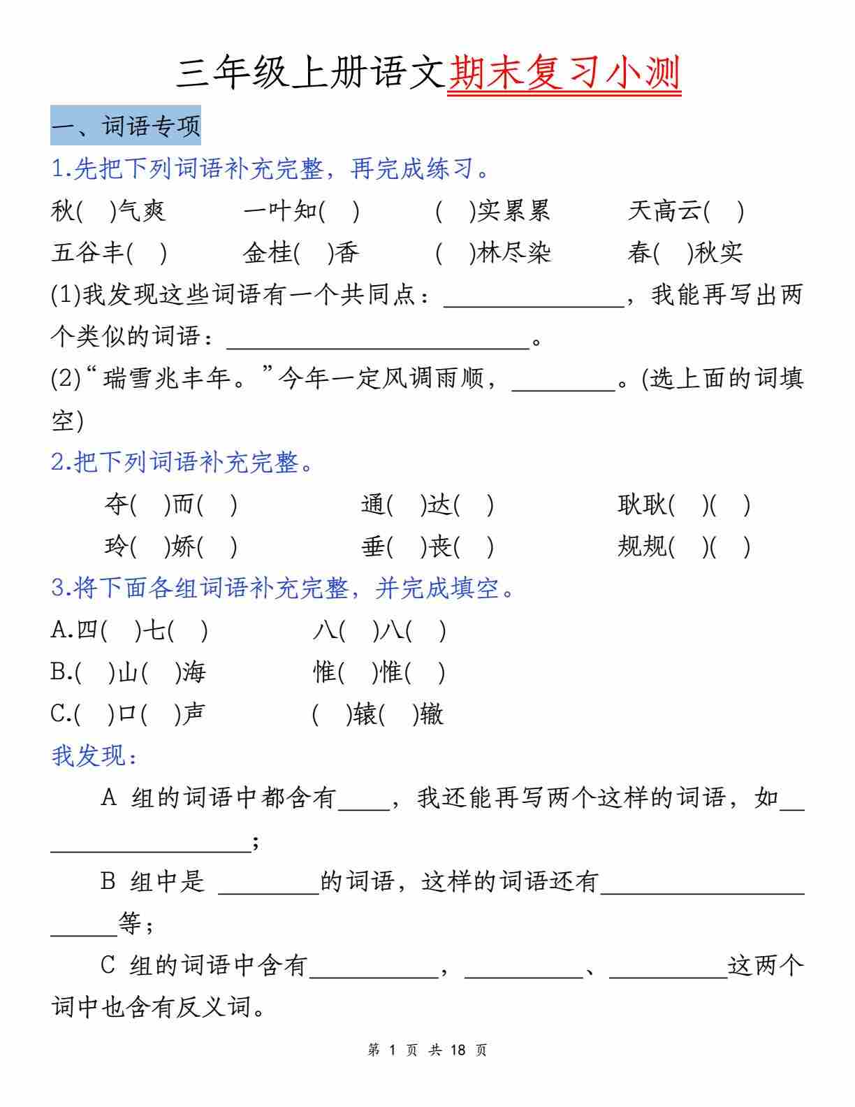 三上语文【期末复习小测(5类)】