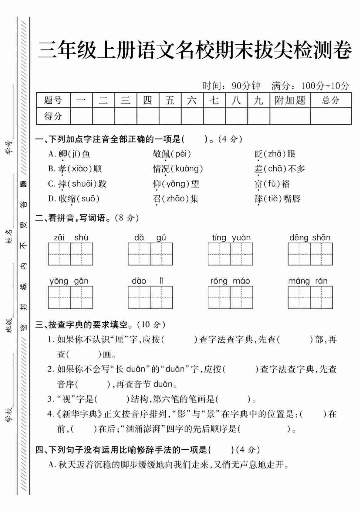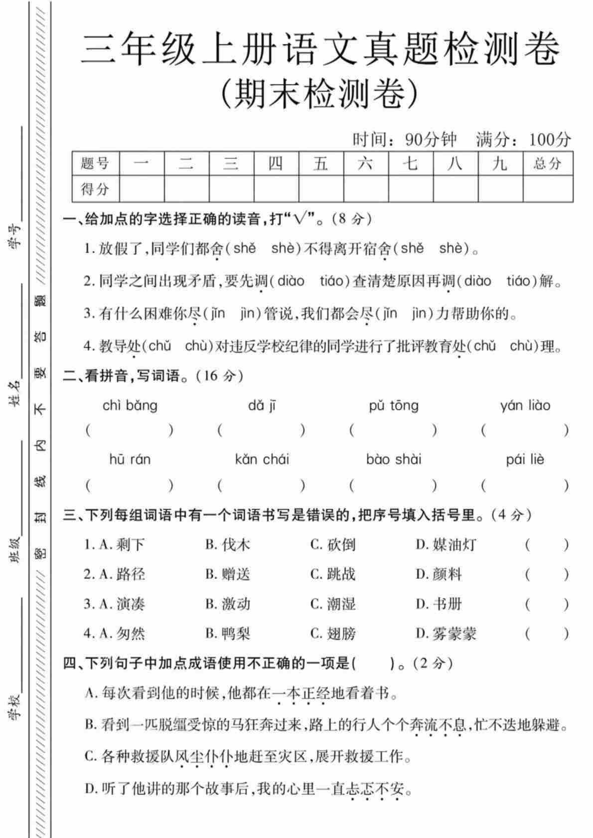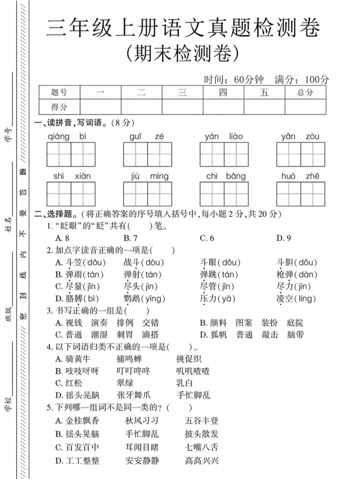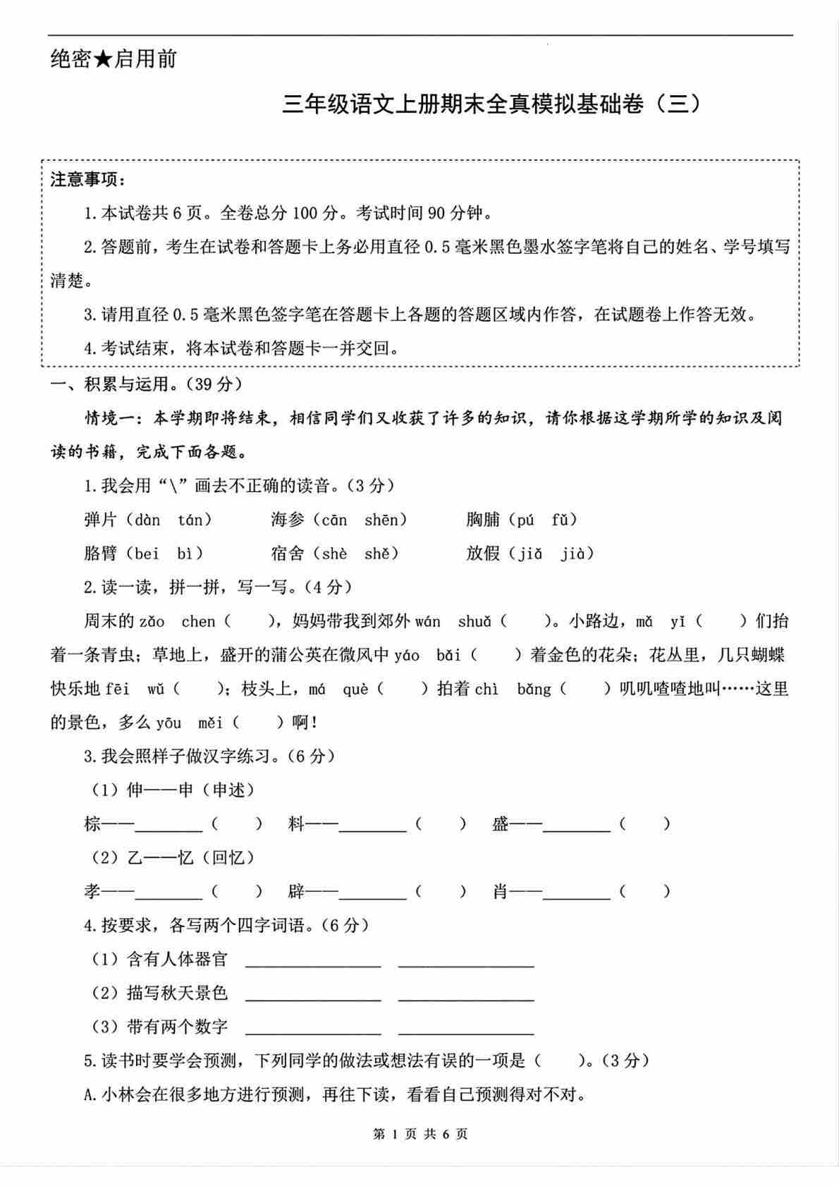 三上语文【期末全真模拟基础卷(答题卡)】5