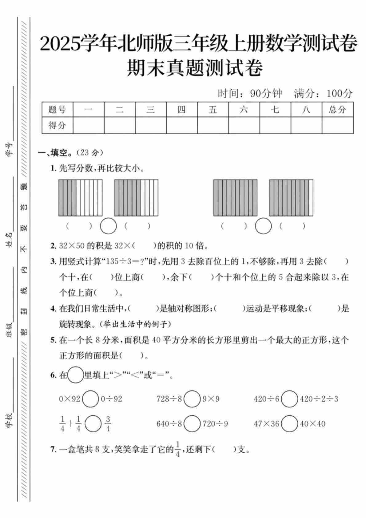 25年北师大版三上数学期末综合素养评价卷(全真演练一)(含答案)
