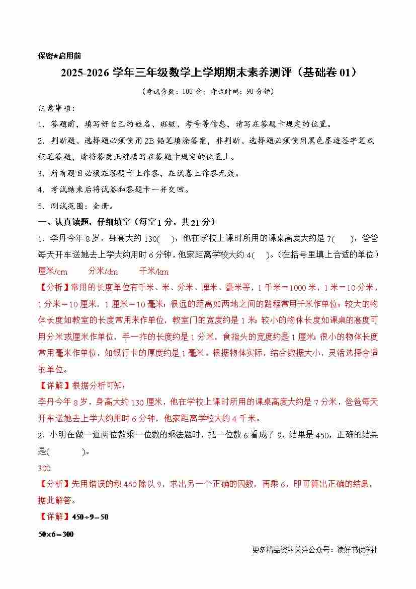 基础卷01-2025-2026学年三年级数学上学期期末素养测评(基础卷01)(北师大版)(参考解析)