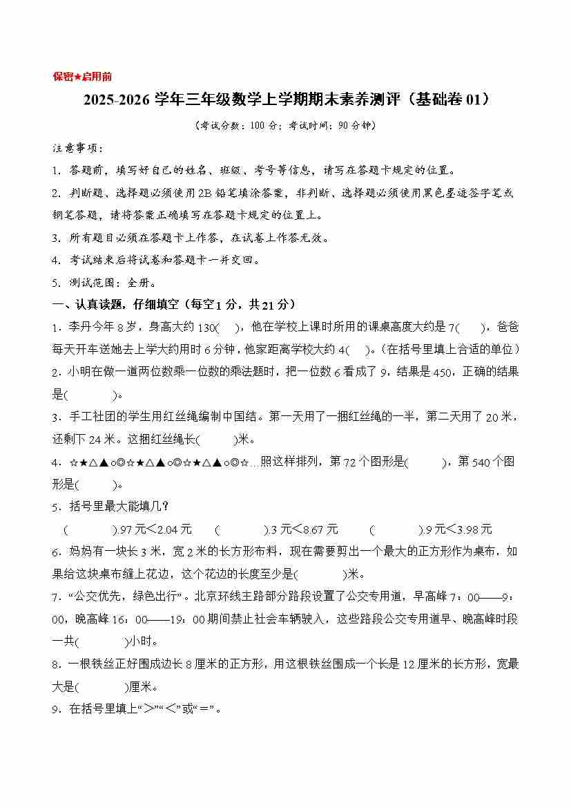 基础卷01-2025-2026学年三年级数学上学期期末素养测评(基础卷01)(北师大版)(考试版A4)