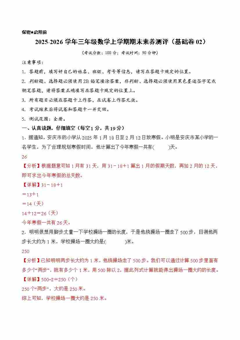 基础卷02-2025-2026学年三年级数学上学期期末素养测评(基础卷02)(北师大版)(参考解析)