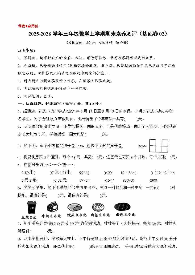基础卷02-2025-2026学年三年级数学上学期期末素养测评(基础卷02)(北师大版)(考试版A4)