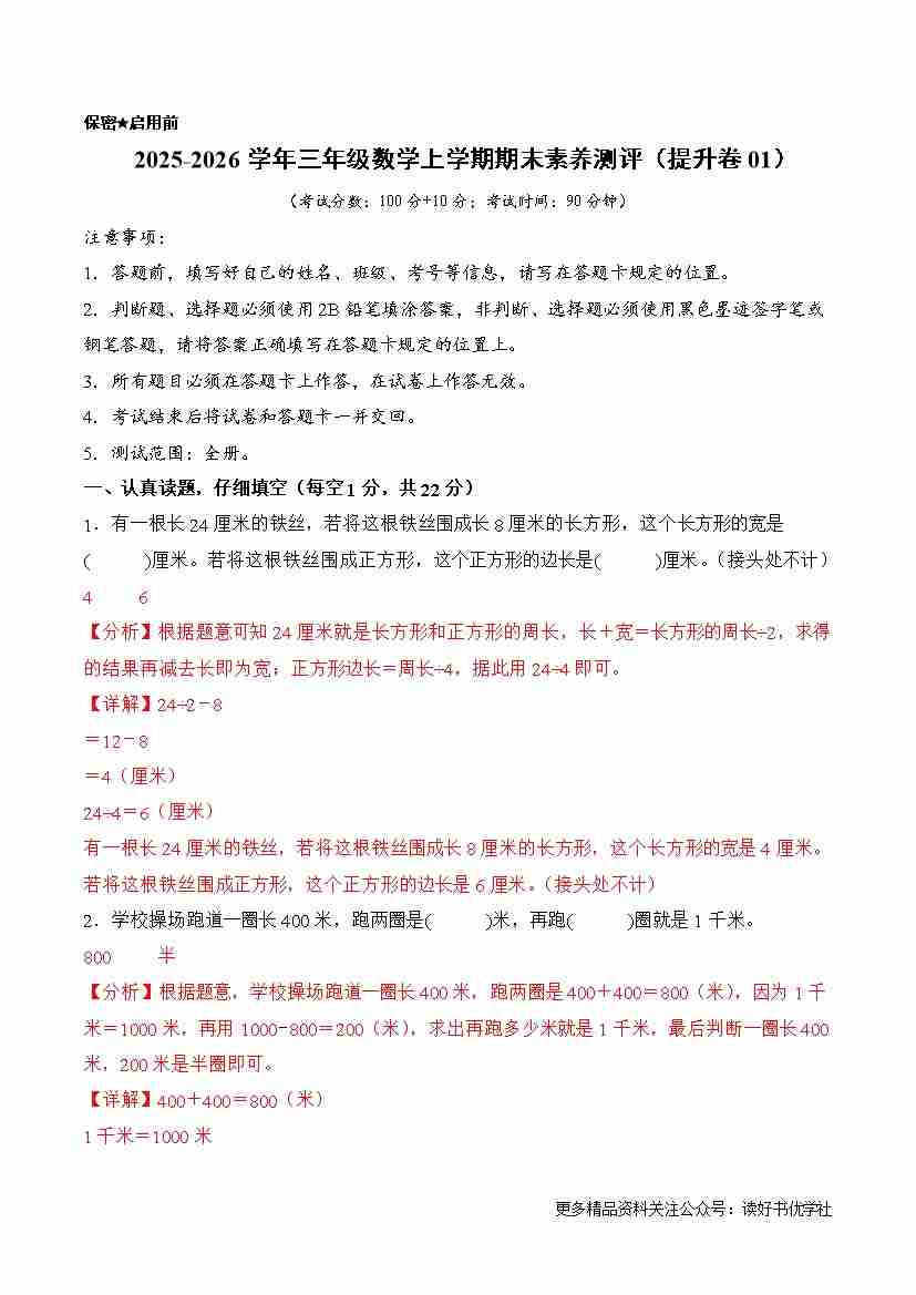 提升卷01-2025-2026学年三年级数学上学期期末素养测评(提升卷01)(北师大版)(参考解析)