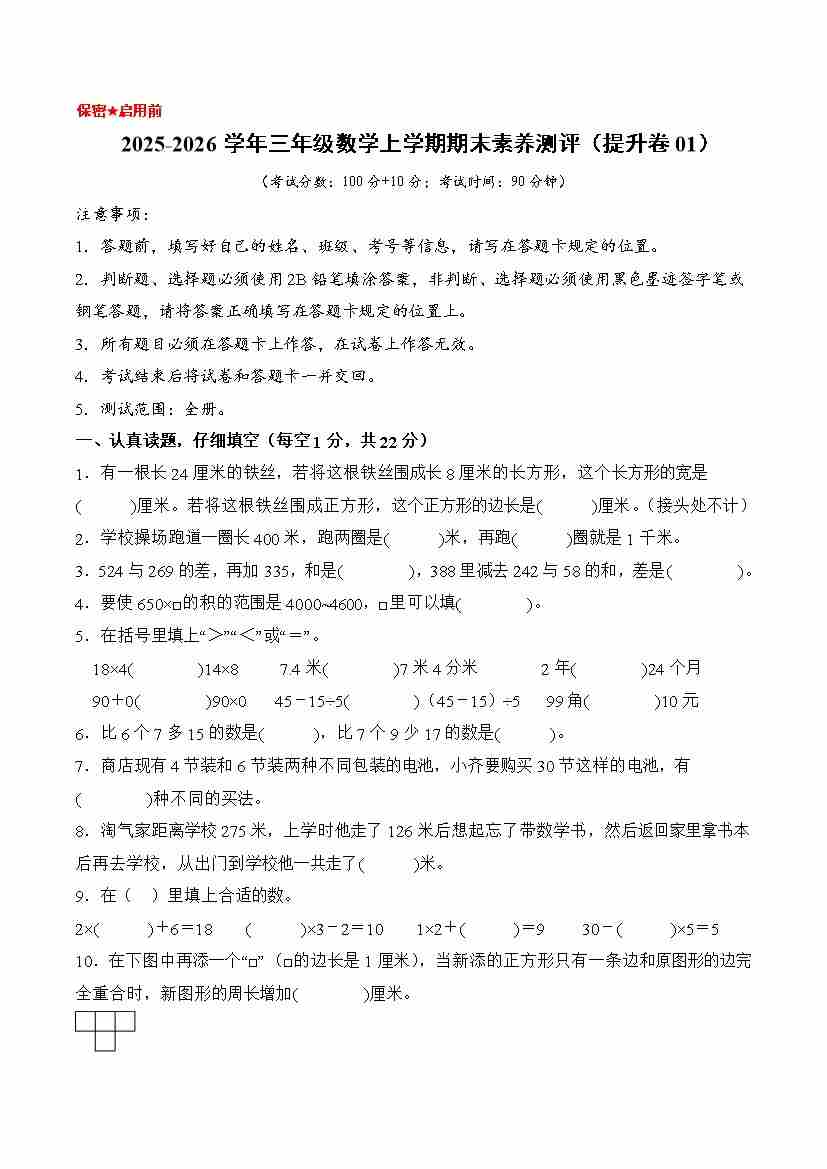 提升卷01-2025-2026学年三年级数学上学期期末素养测评(提升卷01)(北师大版)(考试版A4)