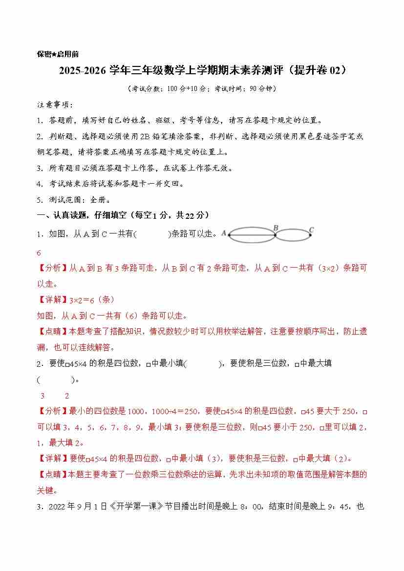 提升卷02-2025-2026学年三年级数学上学期期末素养测评(提升卷02)(北师大版)(参考解析)