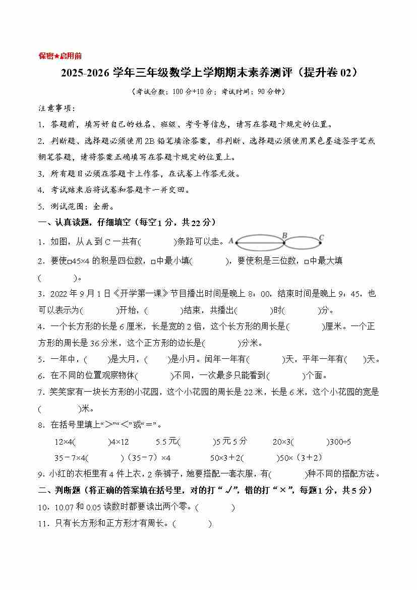 提升卷02-2025-2026学年三年级数学上学期期末素养测评(提升卷02)(北师大版)(考试版A4)