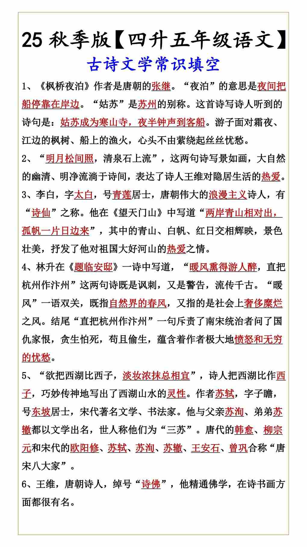 五年级(上)语文 按课文内容填空古诗情境题+理解性默写
